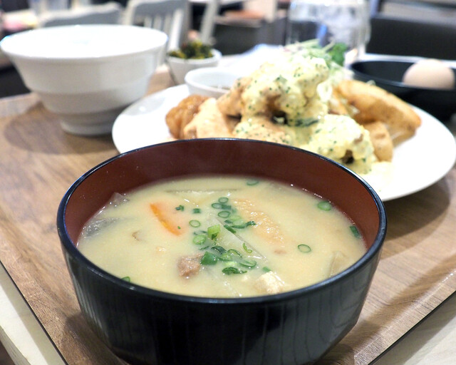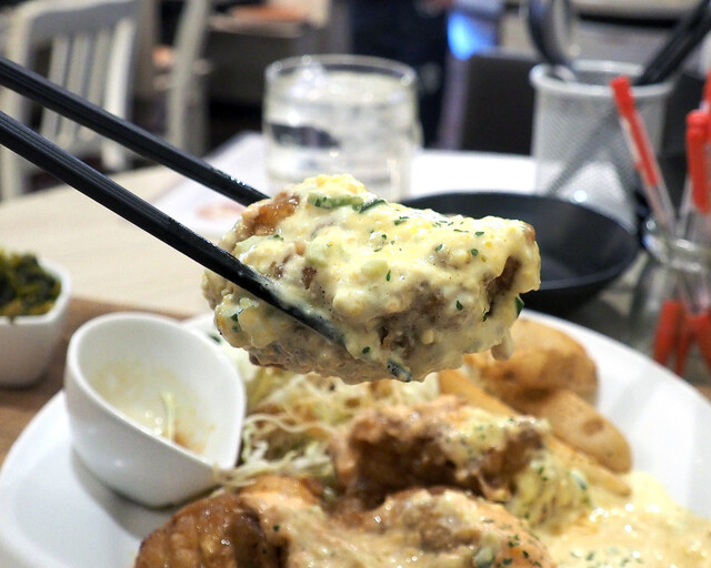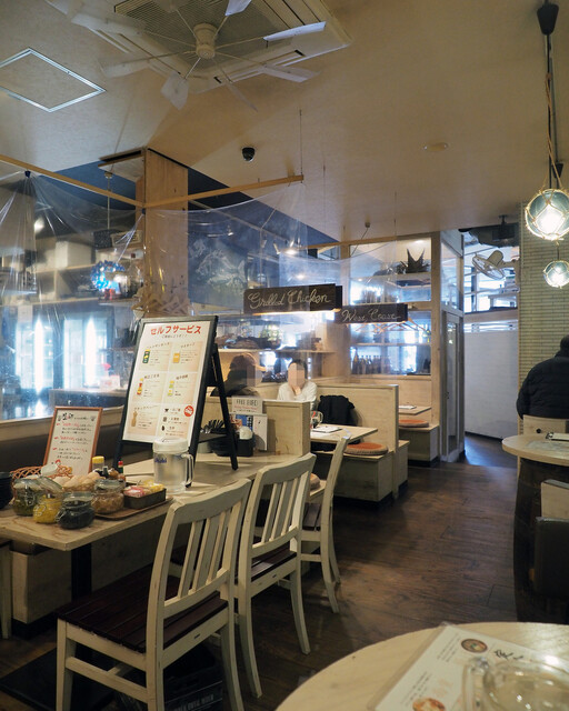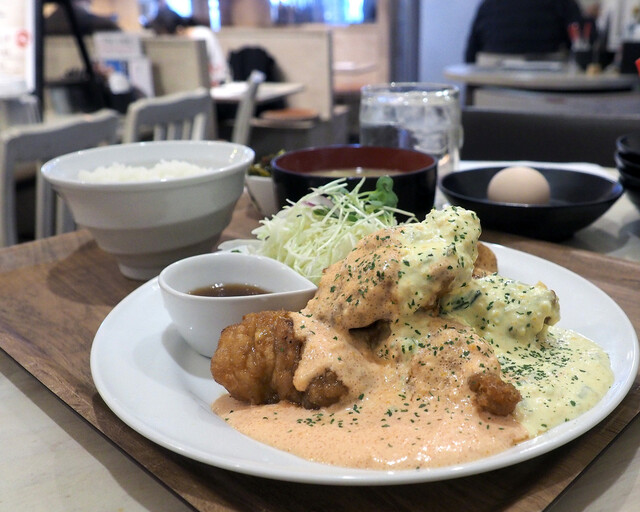 色地に黒文字でチキン南蛮と書かれた大きな暖簾を掲げたお店は、外観だけでなく内装や椅子テーブルなどに白色のシャビーペイントが施されて...