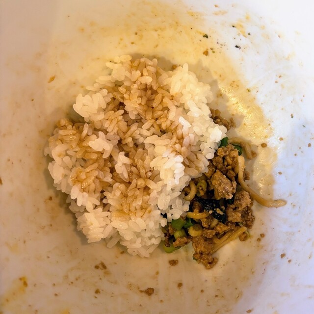 まぜそばはひき肉がたっぷりでごぼうチップスに海苔、水菜、ねぎが入っており全体的にボリュームがあります。