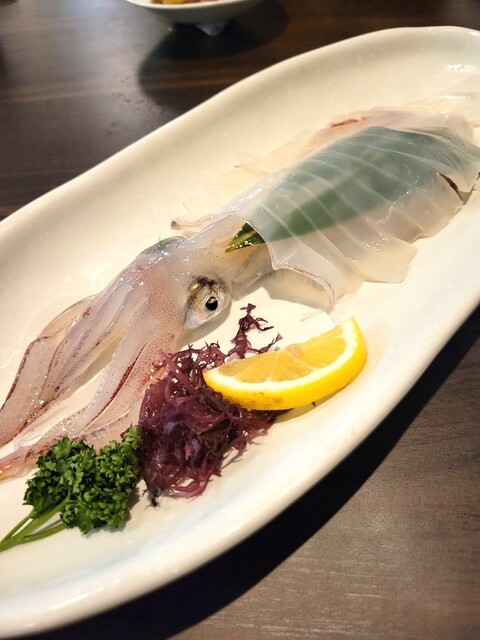 呼子より直送される絶品のイカ。新鮮なイカは活造りが一番! お酒に合う小料理と共にお楽しみください。