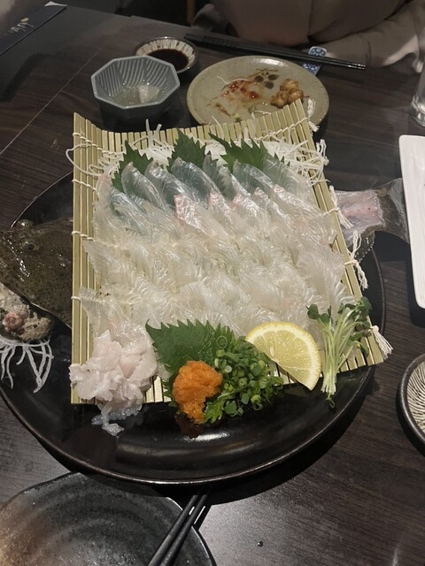 呼子直送いかの活き造りが楽しめるコースをはじめ、店内の生簀から引き上げた鮮度抜群の食材を用いた「活き、いかの姿造り」や「活き、かわはぎの姿造り」が絶品!