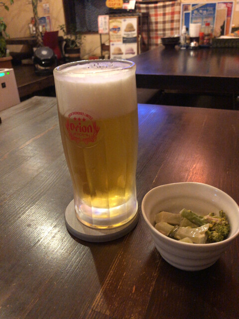 沖縄バルらしくオリオンビールもあります。わたしは飲めないのでシークワーサージュースと沖縄そば(豚三枚肉)レギュラー850円税込をを注文。お通し代は350円です。