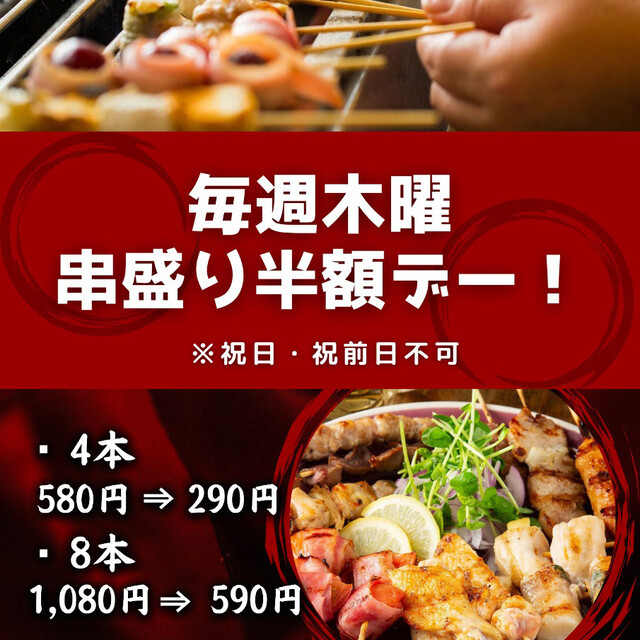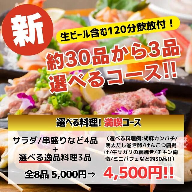 「★3名様以上はこちらから★季節限定【厳選コース】生ビール含む120分飲み放題付!極上の創作串や鮮魚盛りなど全11品 6,000円」がおすすめです。