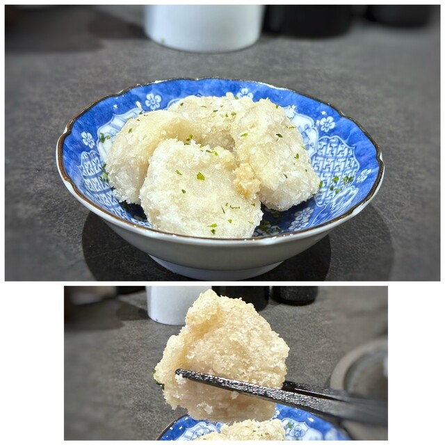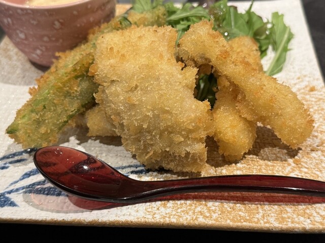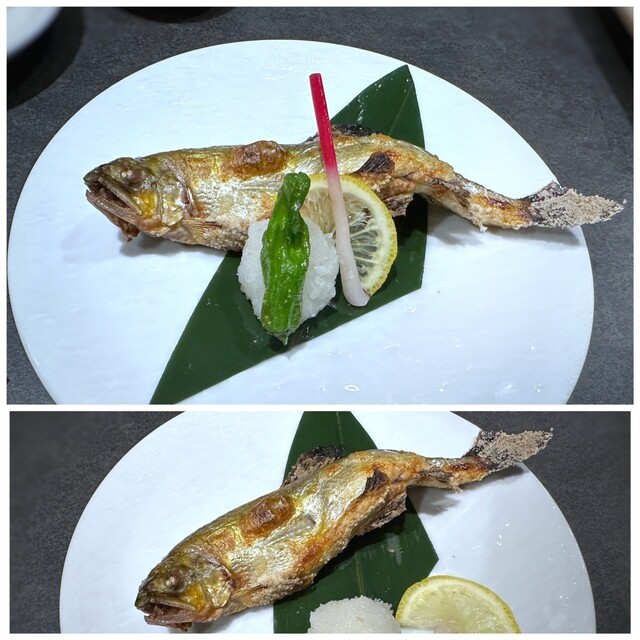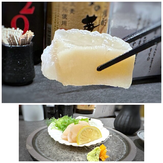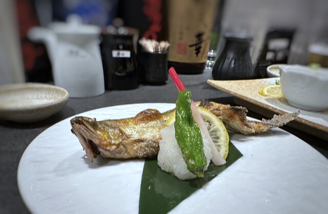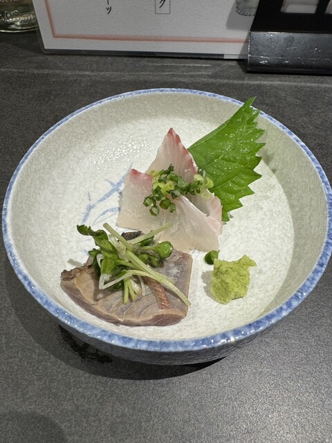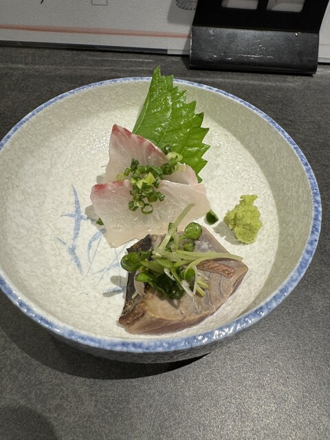 お刺身は、その日のおすすめから白身中心で2種。脂のりは軽やか、角が立った切りつけで、わさびをちょんとのせると清らかに甘みが立ち上がります。炙りの一切れは皮...