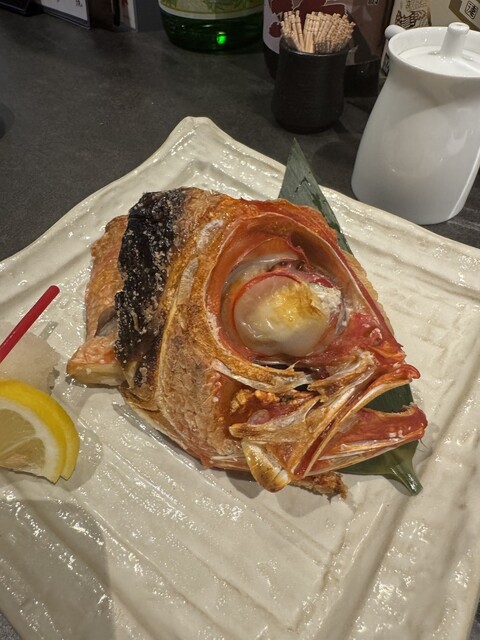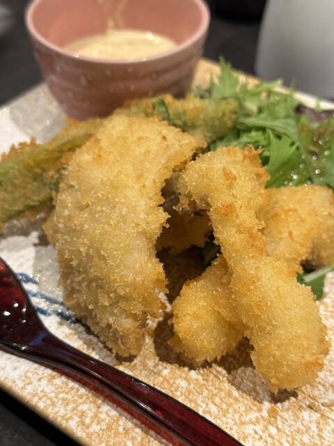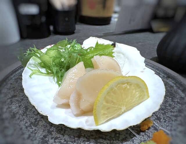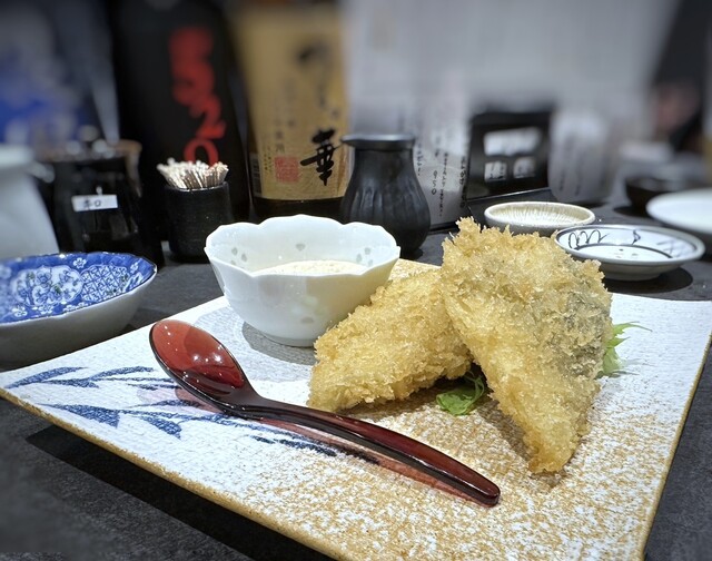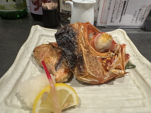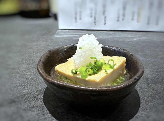 今回は「【超お得!】お刺身・お寿司、名物あじふらい付(全4品)+2時間飲み放題 お手軽3300円コース」をベースに、単品でキンキ塩焼きと揚げ出し豆腐を追加。最初の小鉢は、ばい貝。甘... 詳細を見る