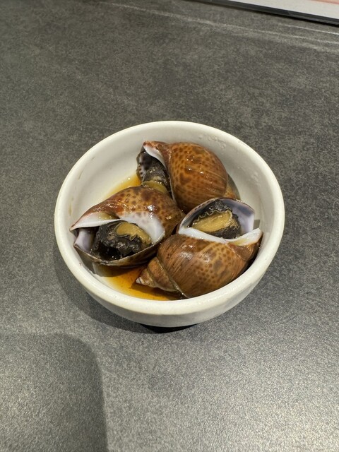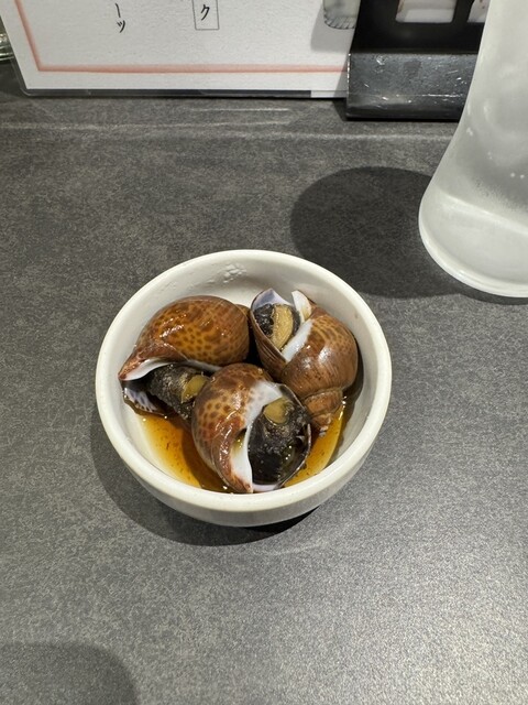 今回は「【超お得!】お刺身・お寿司、名物あじふらい付(全4品)+2時間飲み放題 お手軽3300円コース」をベースに、単品でキンキ塩焼きと揚げ出し豆腐を追加。最初の小鉢は、ばい貝。甘辛い出汁がしっとり染みて、噛むほどに海の香りが広がります。