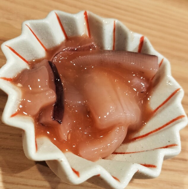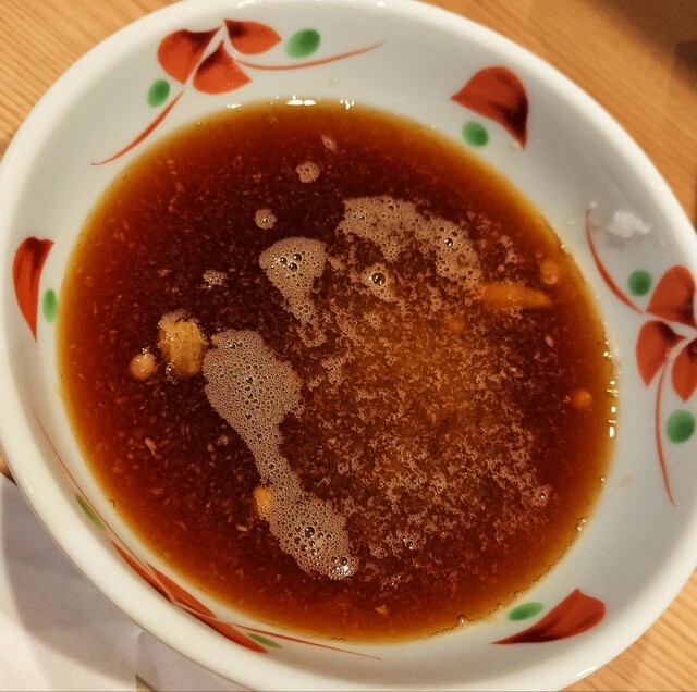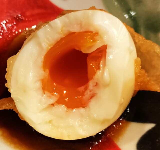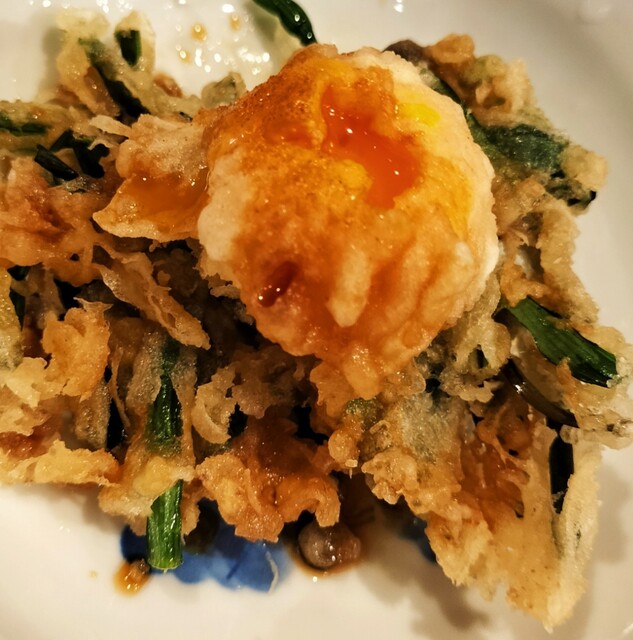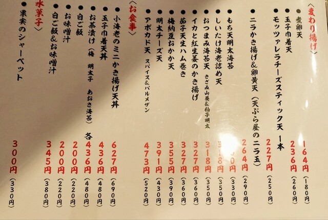 店内の掲示物を見たり味変アイテムなどをチェックしてたら、まずはイカの塩辛、壺漬け、天つゆが用意される。イカの塩辛をつまみながら数分で白ご飯と一陣目の天ぷらが用意される。2陣目は2品のみのため1陣がほぼメイン。天ぷらはどのネタも衣薄づけでカリッと揚がっておりすごく美味しかった。衣が薄いし油感も少なかったので、あっさり食せてもう少し欲しいな。と思い、他のテーブル席の人が注文してて気になった「煮卵天180円」と「玉子巾着天260円」を追加注文。