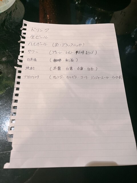 飲み放題のメニューは他のお客さんが見ているとのことで手書きで持ってきてくださいました。