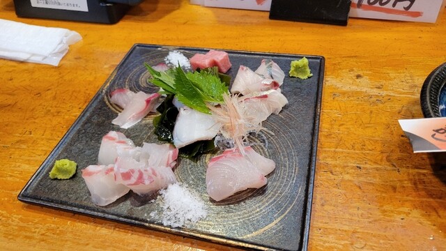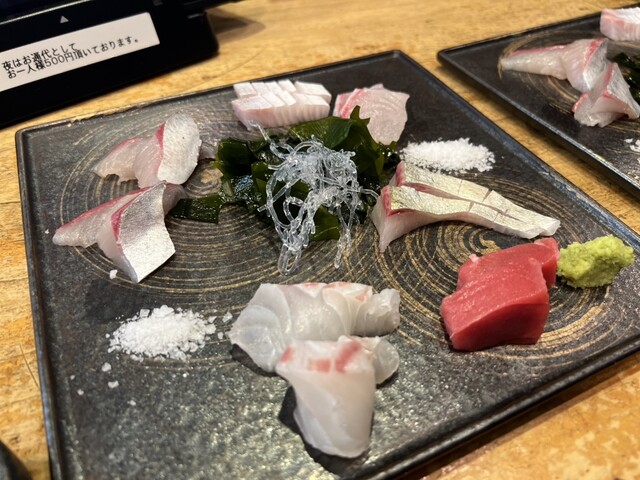 お刺身は醤油も有りますが、塩とわさびがオススメとのこと。生サ...