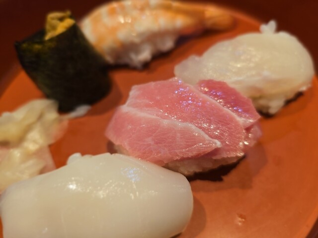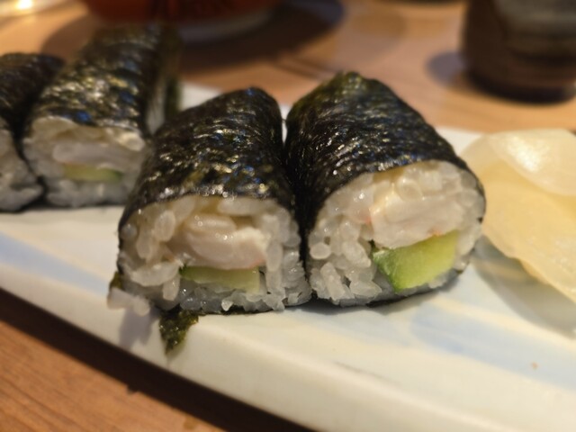 最初に鉄火巻が提供。うっすら色づいた紅生姜を添えて。海苔が美味しかった。