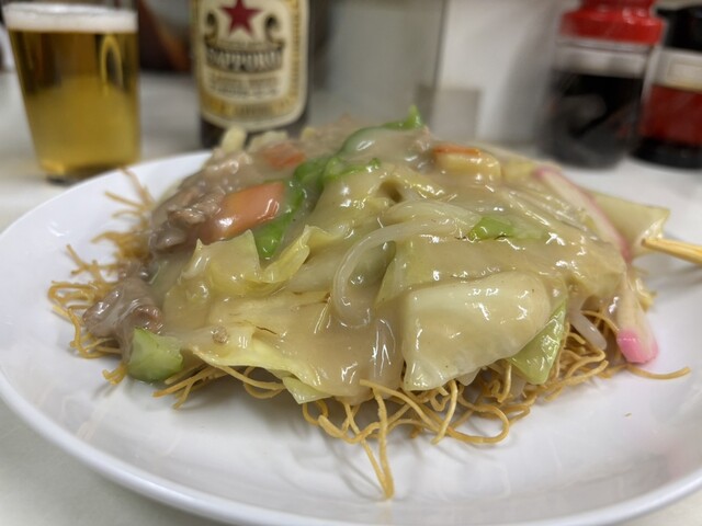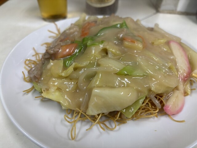 二日続けての訪問。 今度は、皿うどんを頼みました。 麺は細麺を揚げたもので、まさに長崎。 ただ、餡はふた切れのニンジンが色を添えているものの、単一色でのぺっとした感じがぬ... 詳細を見る