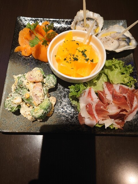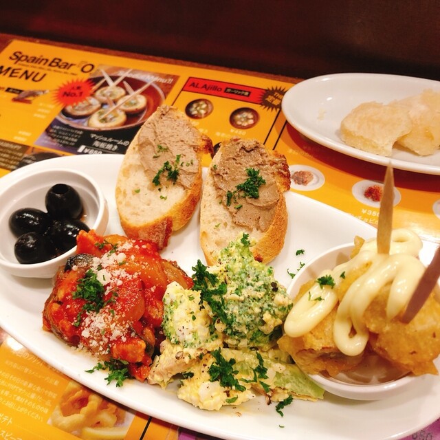 ワンプレートにぎゅっと詰まったタパスは、オリーブ、ブロッコリーの和物、パテをのせたバゲット、爽やかな柑橘系の一口デザートかと思いきやしっかりおつまみ!