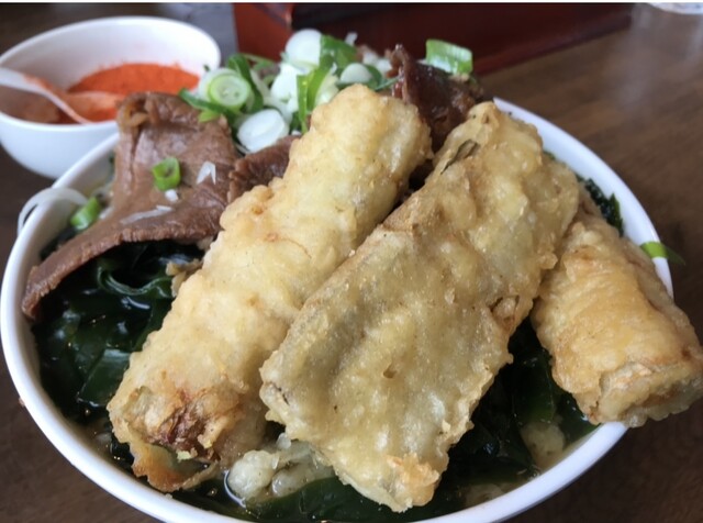 本日は、会社の後輩に連れられてコチラのお店。 詳しい情報がないまま、とにかく好きなうどんにごぼう天をトッピングせよとの命だったので、肉うどんにわかめトッピングし、更にごぼう天は、... 詳細を見る