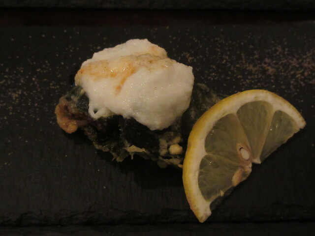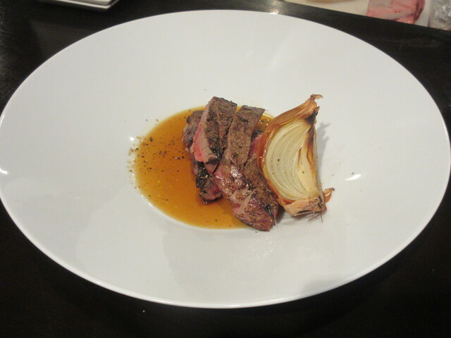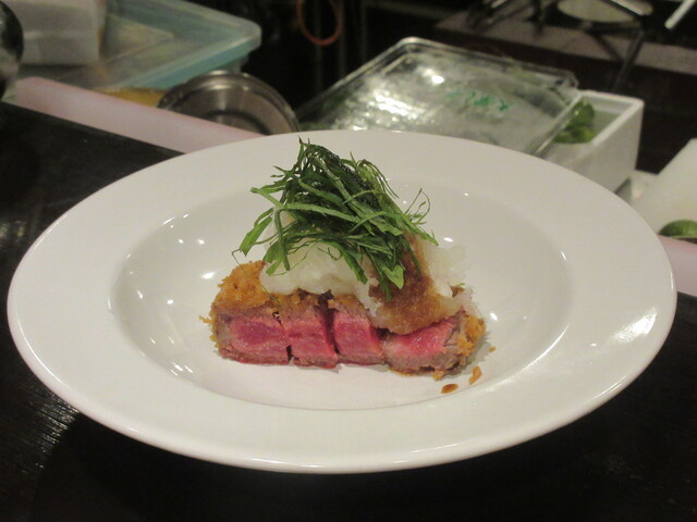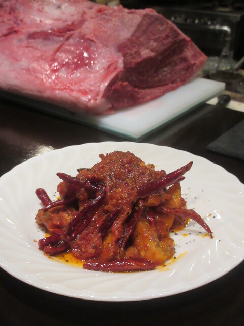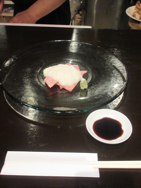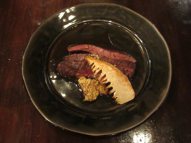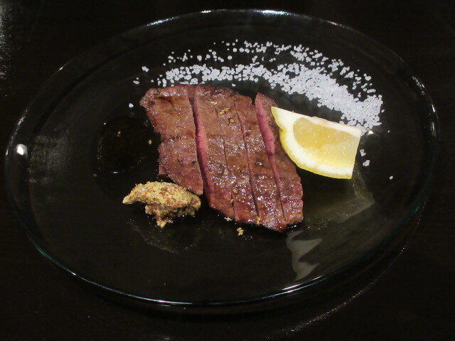 ハラミのフレット、山芋と醤油掛け、手前にワイン塩