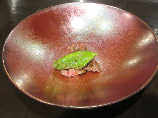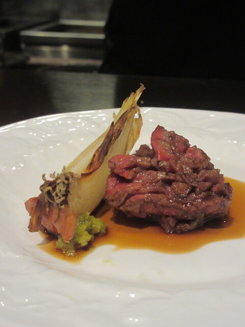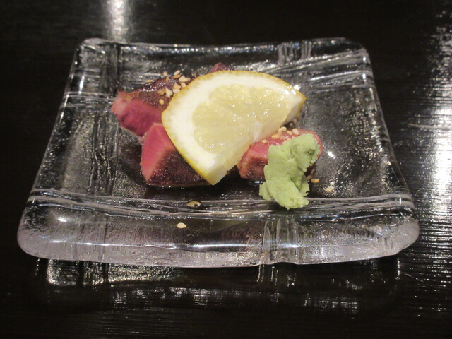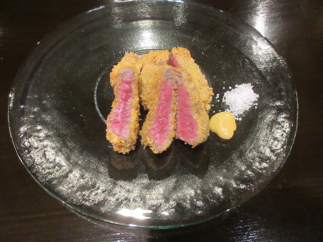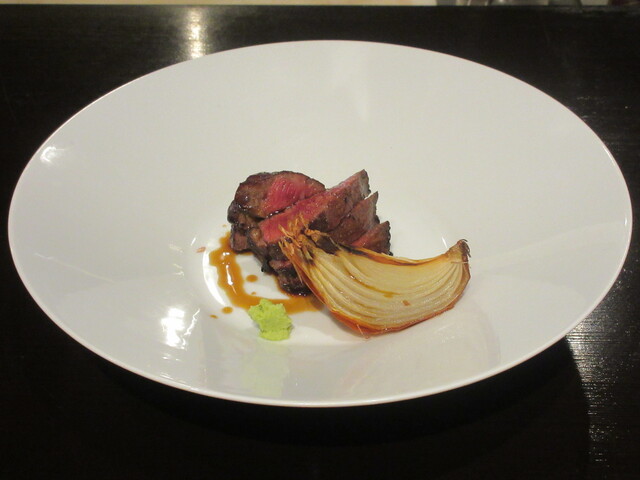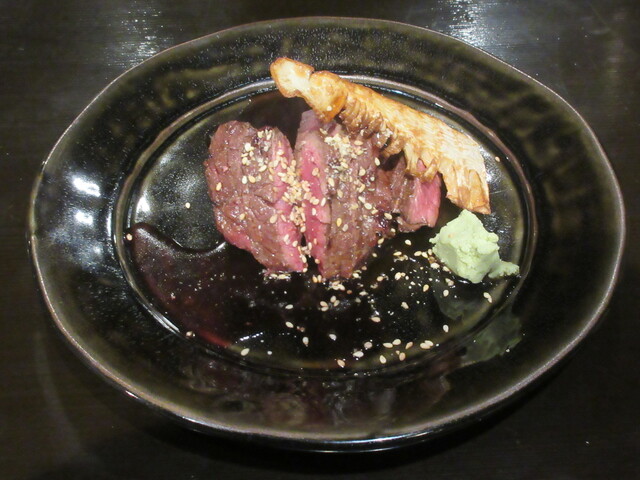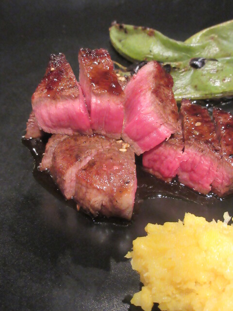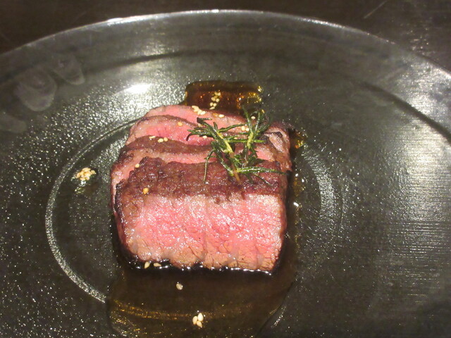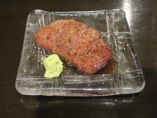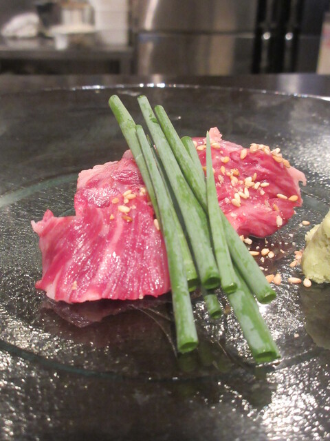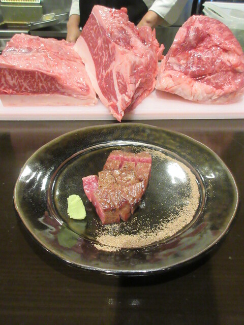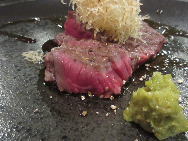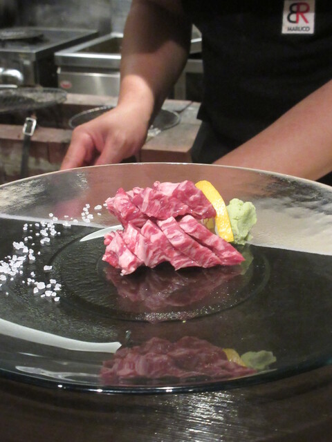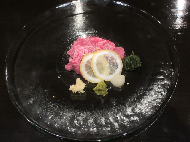 5000円コースの始まりは、宮崎牛さがりの刺身、山葵・醤油・塩で