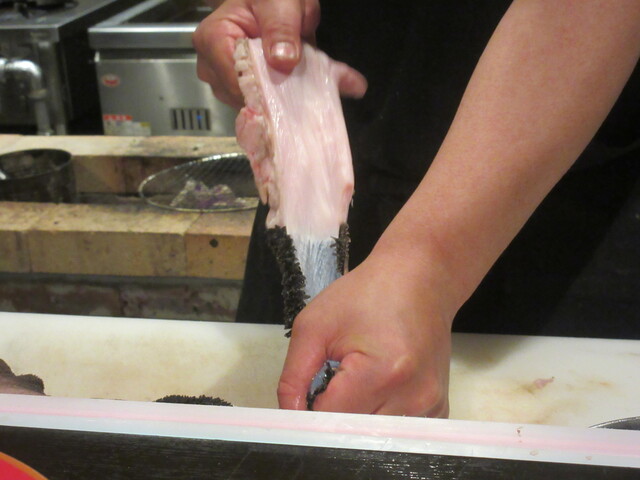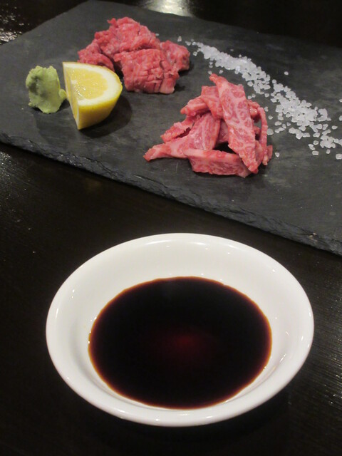 横隔膜を刺身で、わさび醤油・ワイン塩と