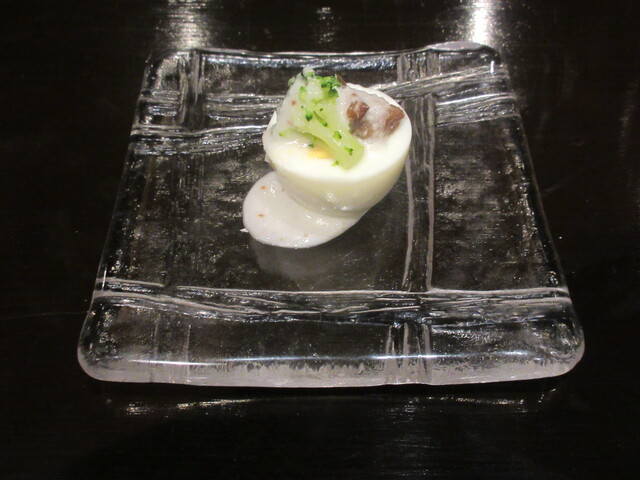 鹿児島牛サガリを生で、タレがかけてあり卵黄を中央に落として…