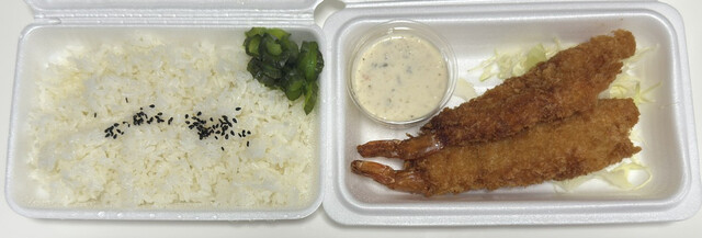 以前に当店で買ったチキン南蛮が結構美味かったなと来店。んでメニュー表を見ると期間限定で新作の倍の倍のエビフライ弁当発見伝。じゃソレ!