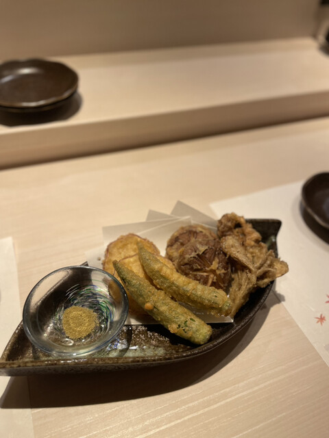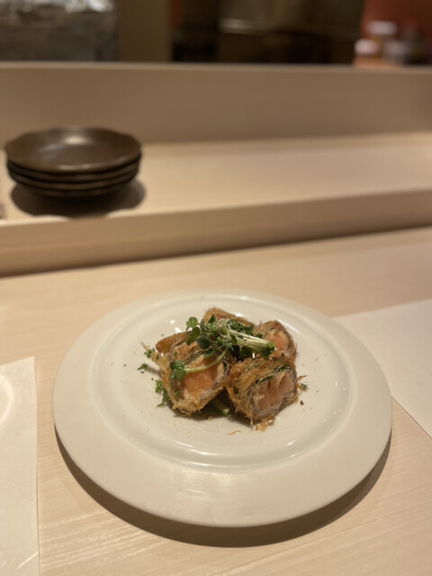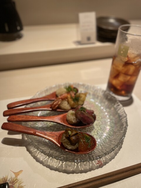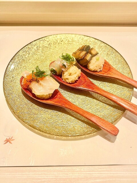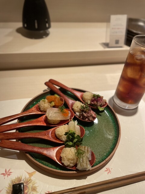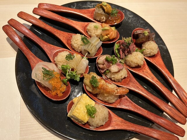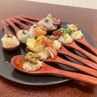 肉、魚、野菜を全て一口サイズでご提供します。 味よし見た目よし。小倉では珍しいスプーン寿司のコースをリーズナブルに。