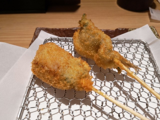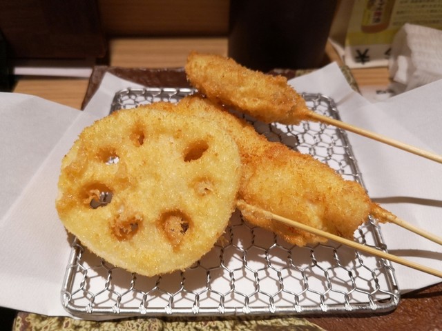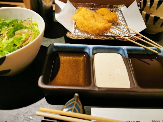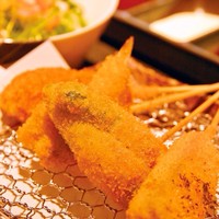 入口を開けると、ここが串かつのお店かと目を疑うようなモダンな雰囲気の店内。25年間、串かつの名店として黒崎で愛された味を八幡駅前でも味わう事ができます。 当店大人気の「おまかせ串かつ」は、20種類の揚げたての串かつがご満足頂けるまでつぎつぎに出てきて、たくさん食べると1本あたりの金額が110円まで下がって大変お得。サイドメニューも豊富で鮮魚刺や牛さがりステーキ、真鯛の西京焼きなどを取り揃えています...。