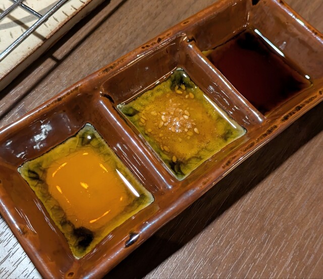左から ポン酢、ゴマ油&塩、九州醤油