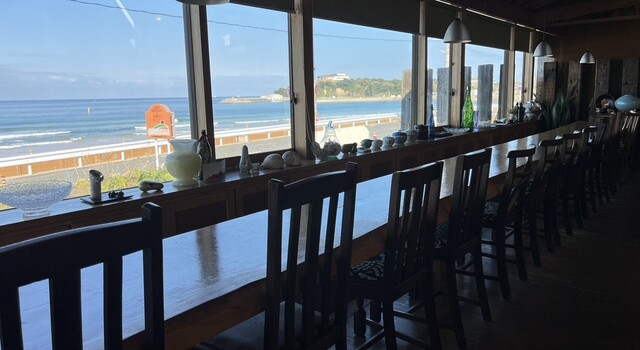 カウンター席からは目の前の岩屋海水浴場が一望。