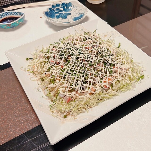お好み焼きのようにマヨネーズがかかった海鮮サラダは予想をはるかに上回る美味しさで絶対に食べてもらいたい一品です!