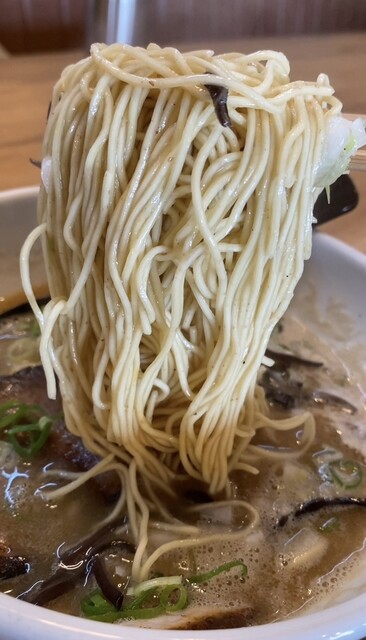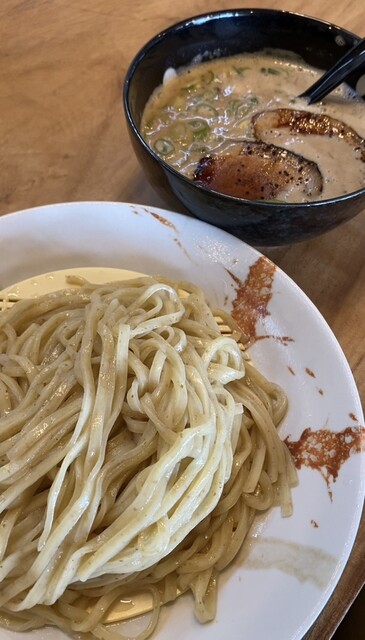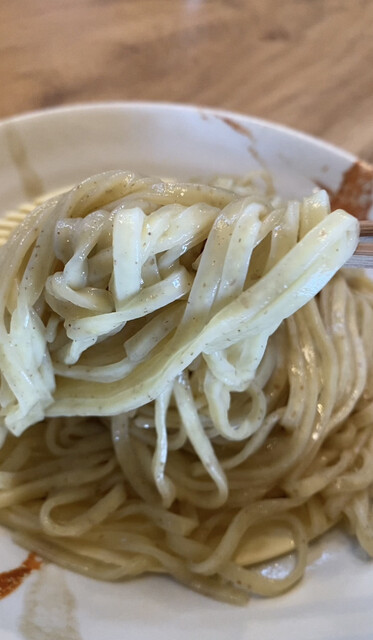 つけスープは意外にも濃く無く、クリーミーな泡系。多めのブラックペッパーとクリーミーさで、コレはカルボナーラを彷彿とさせる。大量なネギと刻み玉葱がシャキッとイイ。