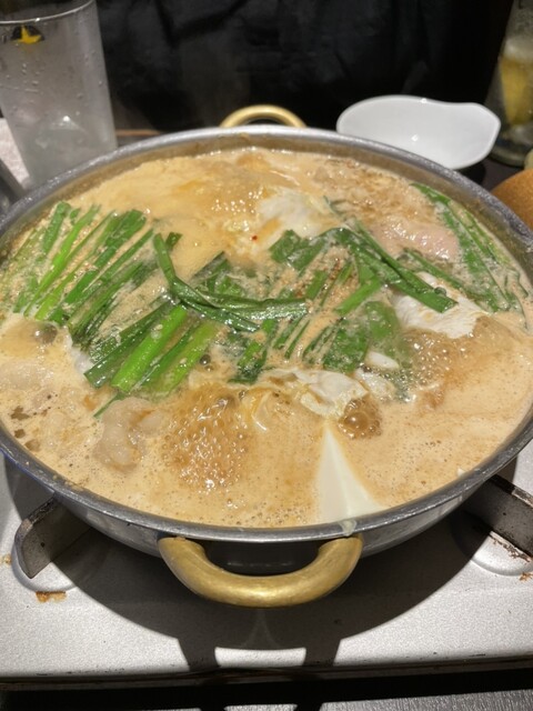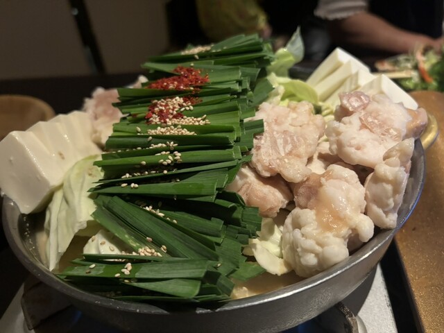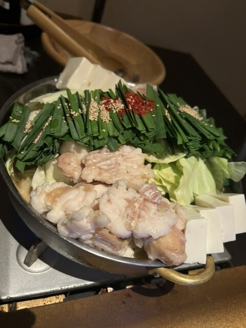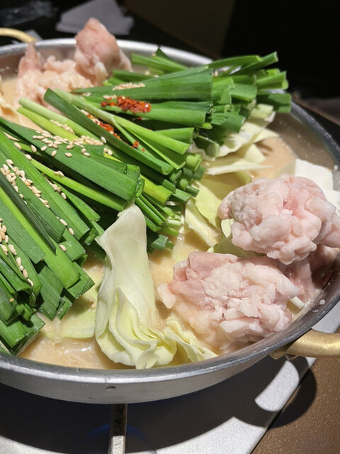 お店の売りはやはりモツ鍋。味噌をベースにした白鍋、赤鍋、そして醤油ベースの鍋の3種類あります。今回は1番人気の白鍋を注文しました。味噌ベースのモツ鍋はやま中さんを彷彿...