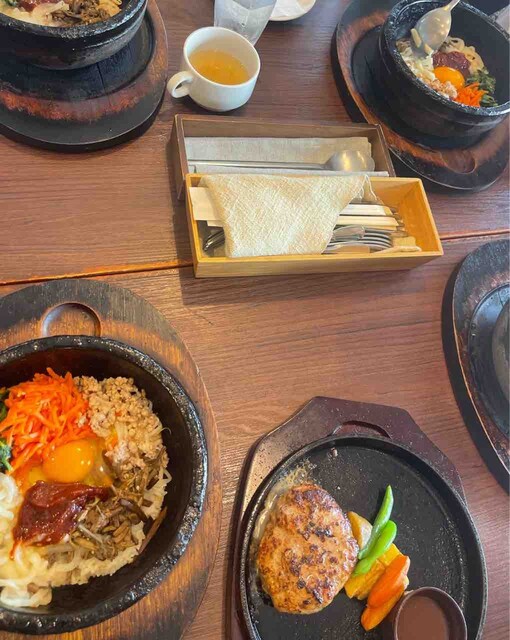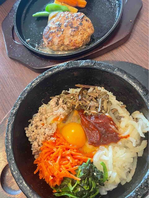 3人で、明治屋ハンバーグとスパゲッティナポリタンを和セット(ご飯・味噌汁)・ミニサラダ・明治屋ハンバーグとふわとろオムライス・石焼ビビンバを注文しました。