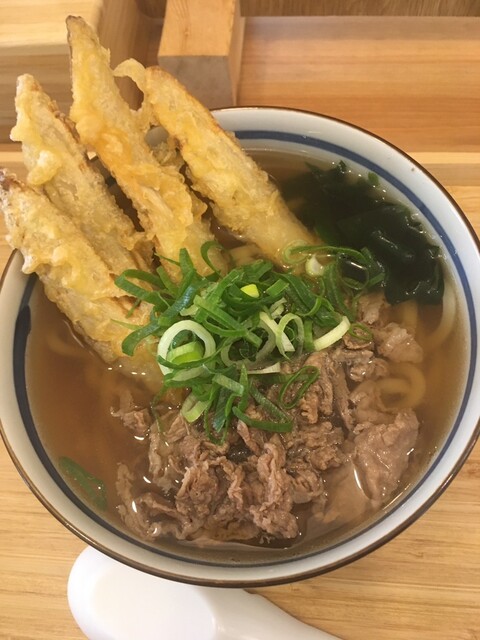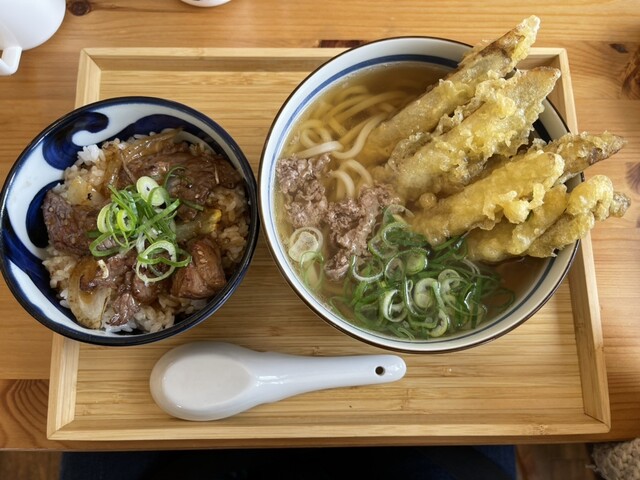 ずっと気になっていたお店です。 ようやく行けました。 日曜日の12時前に入店。 先客はありません。 奮発して、数量限定の「ごぼう天うどんと黒毛和牛焼肉ごはん(並)のセット(1,390円)」を頼みました。 待っている間に、店内のホワイトボードに「本日の焼肉ごはんは、黒毛和牛のザブトン... 詳細を見る