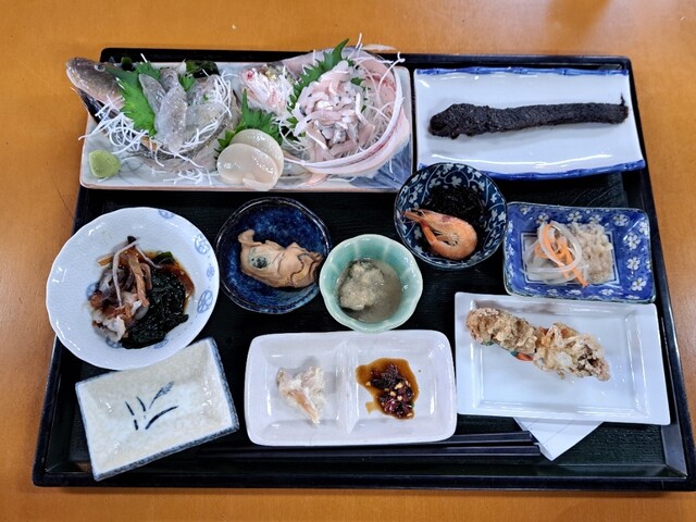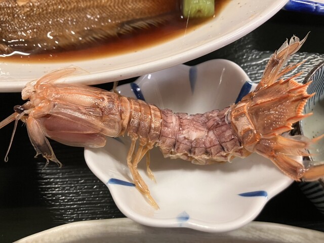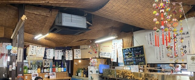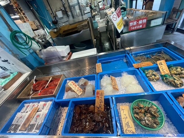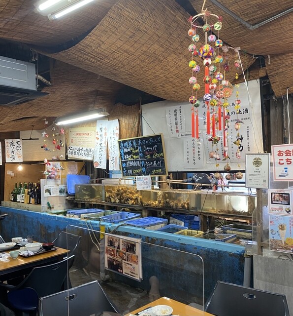 食堂の隣が鮮魚店で、複数の生け簀があり、期...