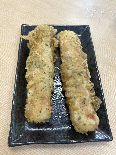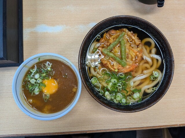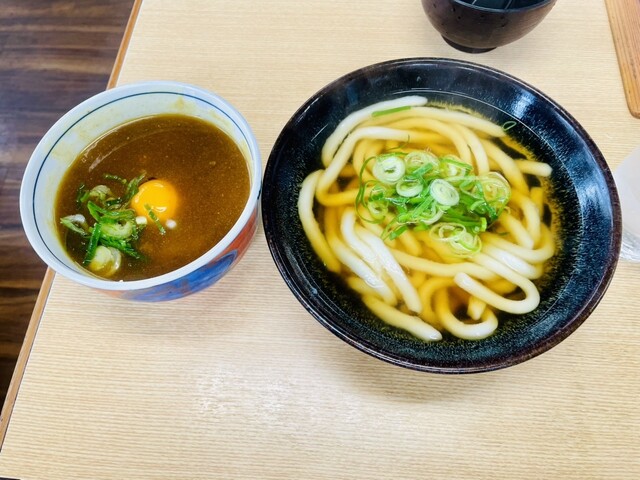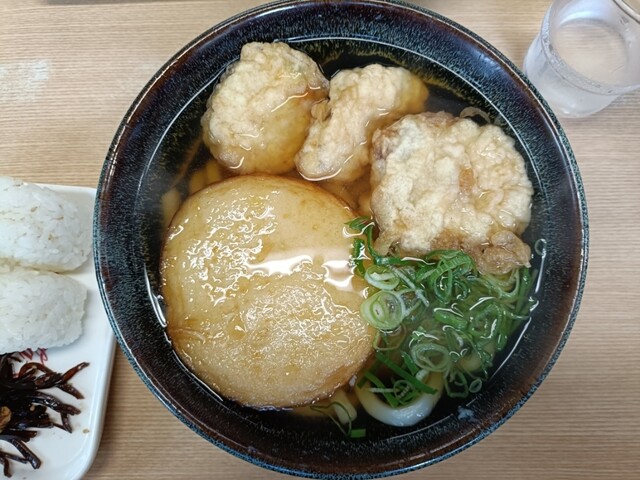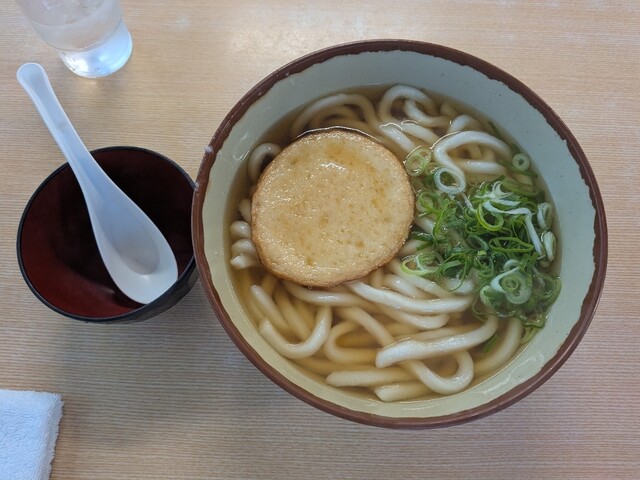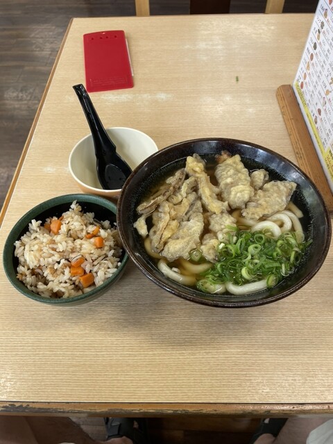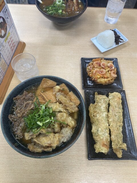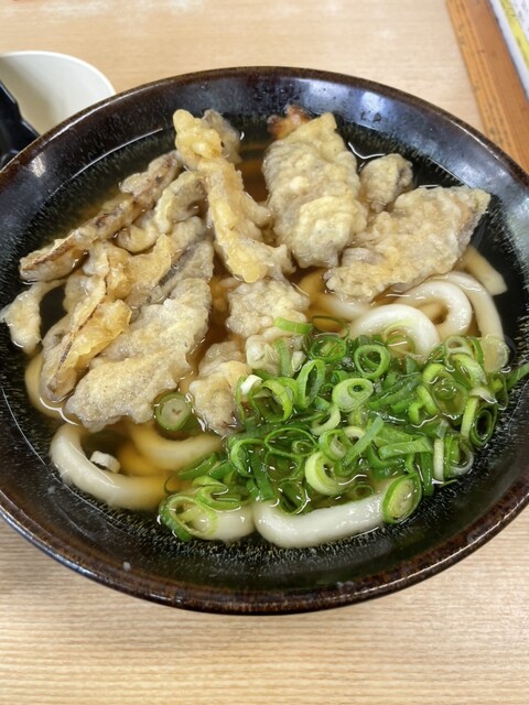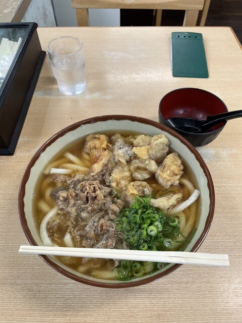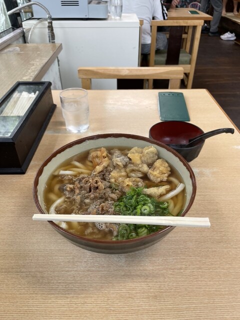 肉うどんにゴボウ天トッピング。まあまあの空腹だったので大盛り。取り分けできるようにお椀も持ってきてくれたけど、熱々やし多かったから助かりました。お餅みたいな太いうどんでヤワなのでお腹パンパンになりまし...