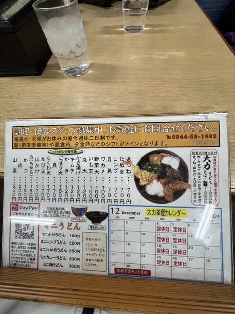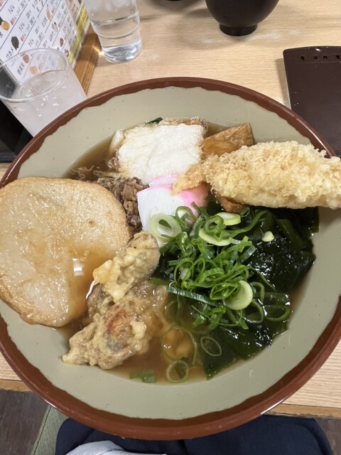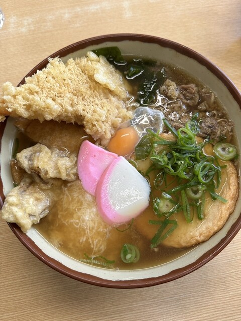 全部入りの大力うどんを注文した。肉や卵、丸天、海老天など全部入りのうどんで、ふつうの器より大きい器で出てきました。うどんは博多うろん系の太くてもっちりとした麺、甘めのスメです。こんなに入って930円は...