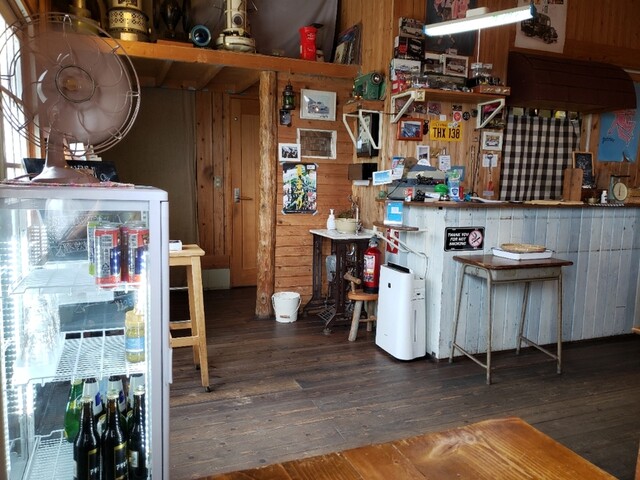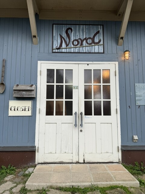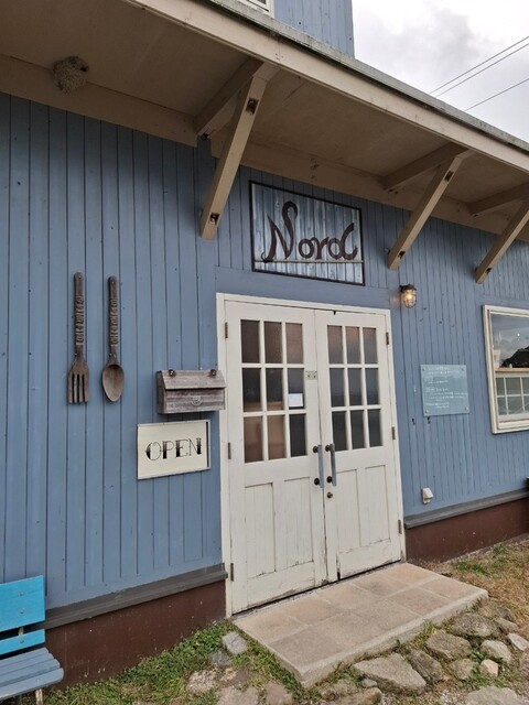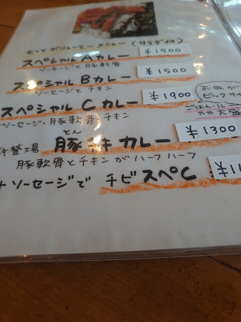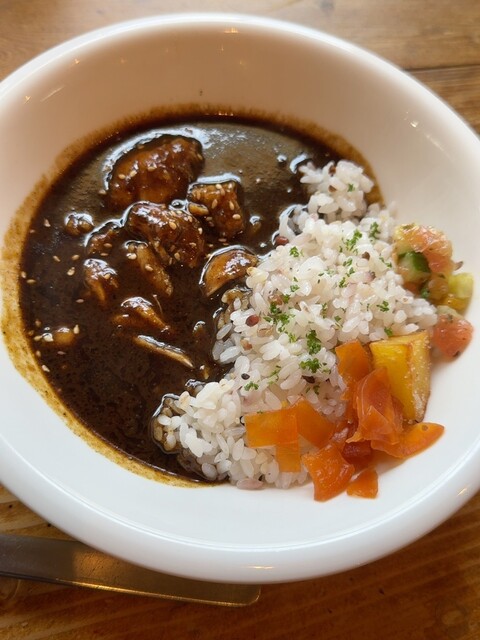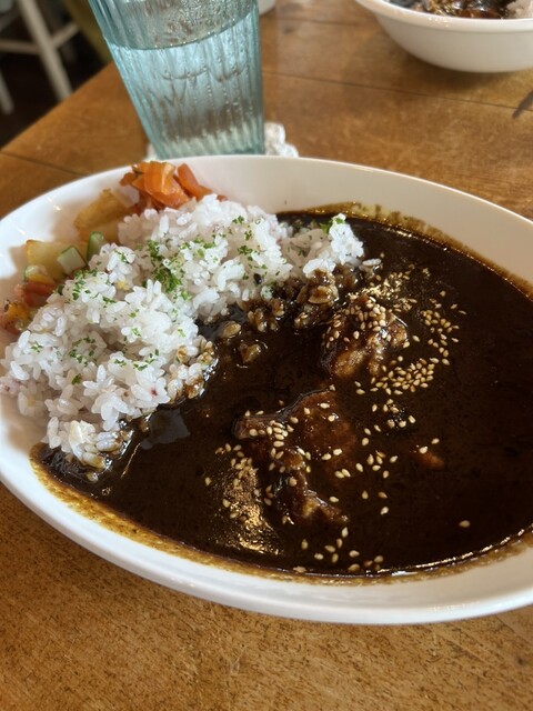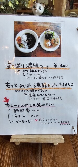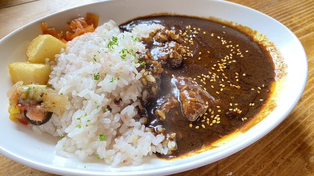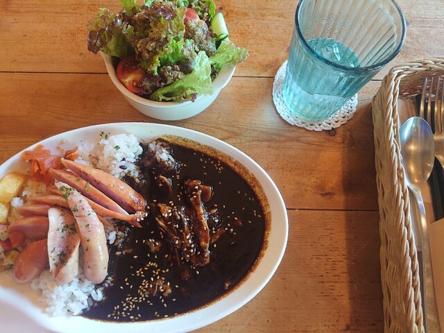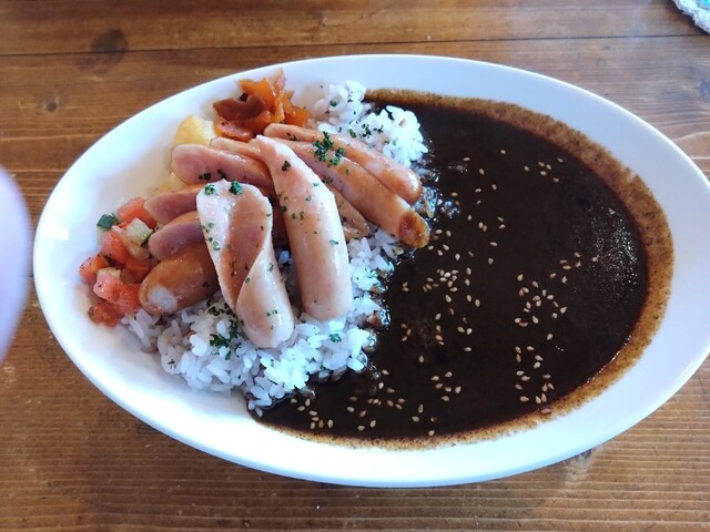 ライトブルーの可愛いお店!なかに入るとアンティークな小物で一杯です。さて、カレーのルーは、玉ねぎをよく炒めてキャラメル色のスパイシーなカレーです。豚軟骨とチキンとソーセージの3種類のカレーが選べます。...
