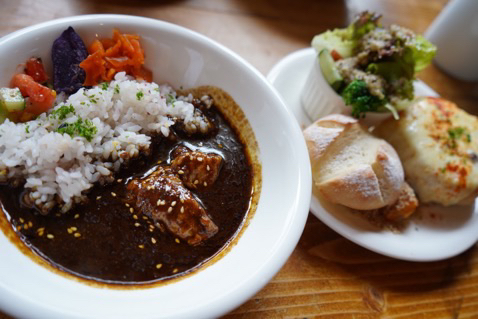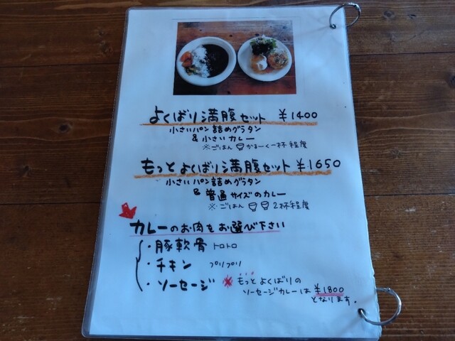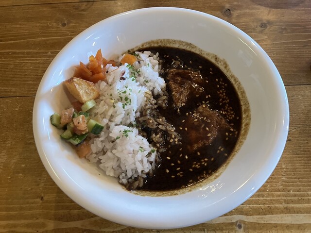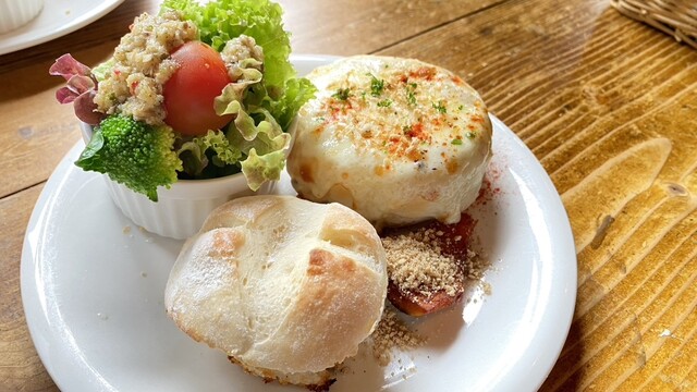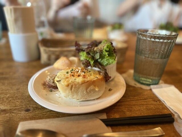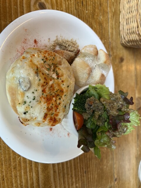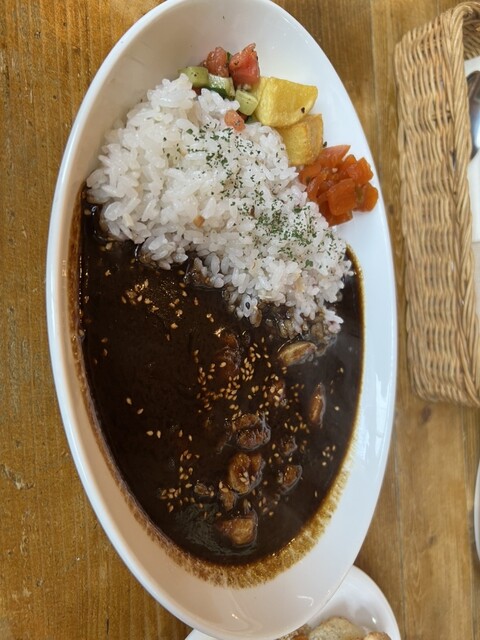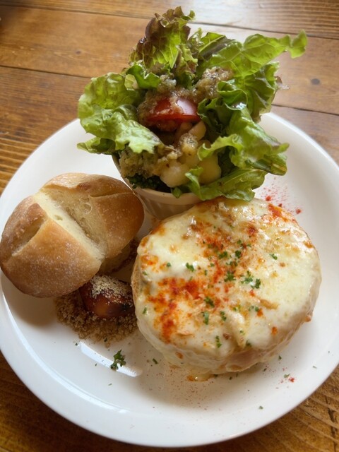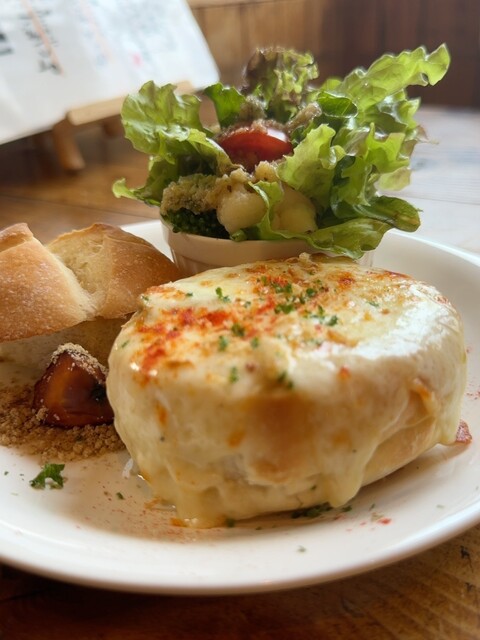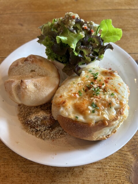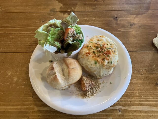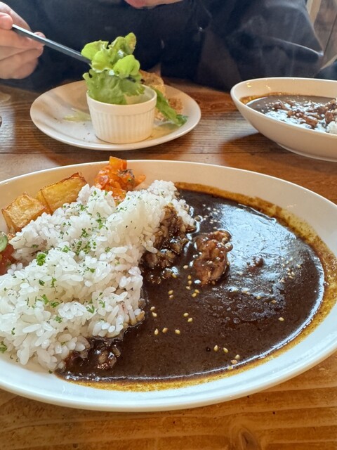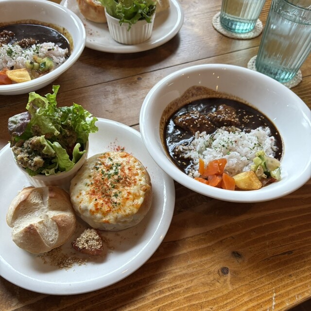 糸島観光の帰りにランチで訪れました。少し坂を上ってたどり着きました。駐車場は3台ほど停められるスペースがあるようです。メインは少し辛めの黒いスープのようなビーフカレー、そしてパンに包まれているグラタン...