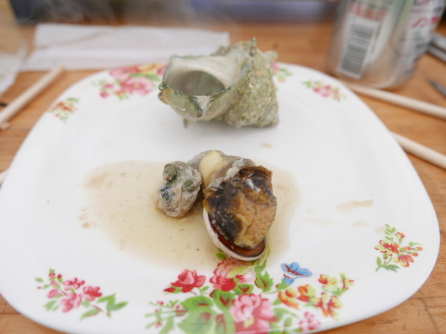 牡蠣とサザエを炭火でガンガン焼きながら、ガンガン食べてタウリン補給!