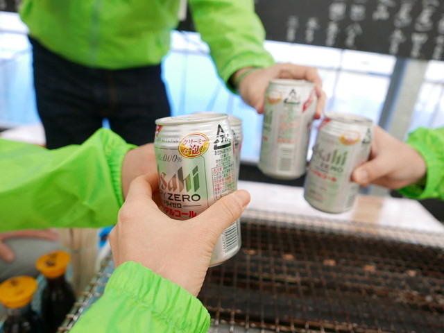跳ね防止のグリーンジャケットを装着し、ノンアルビールで乾杯!