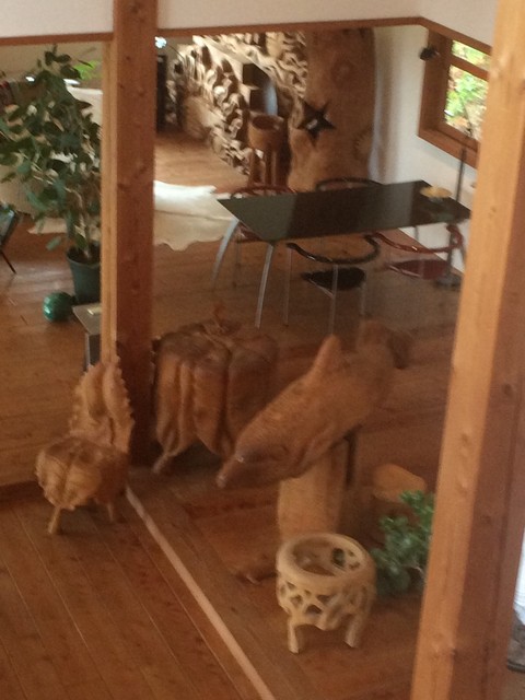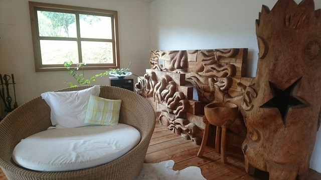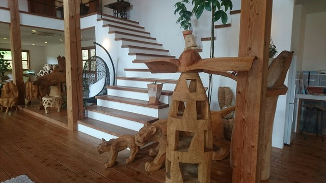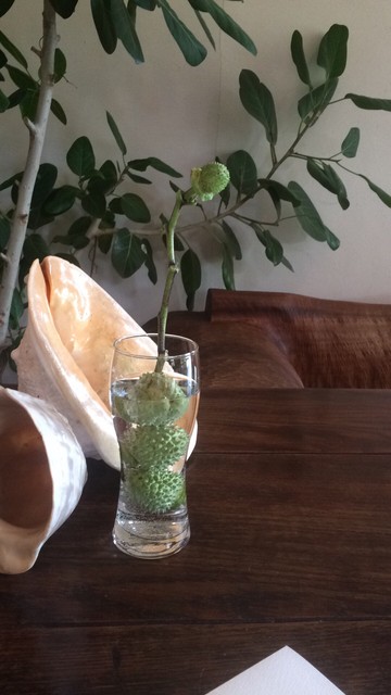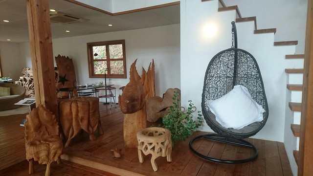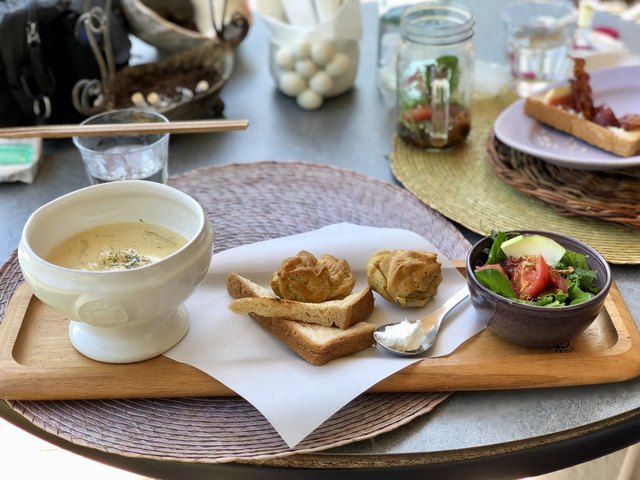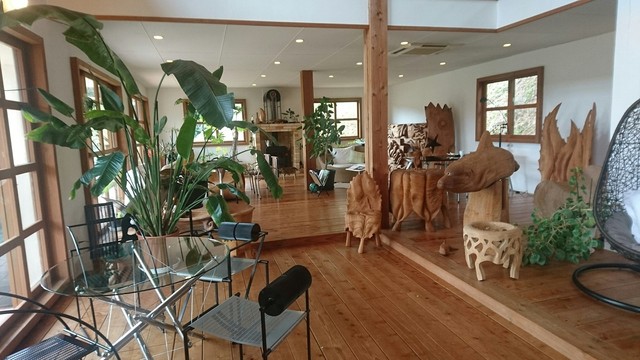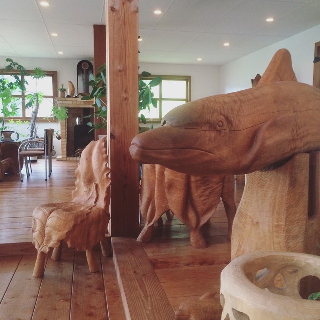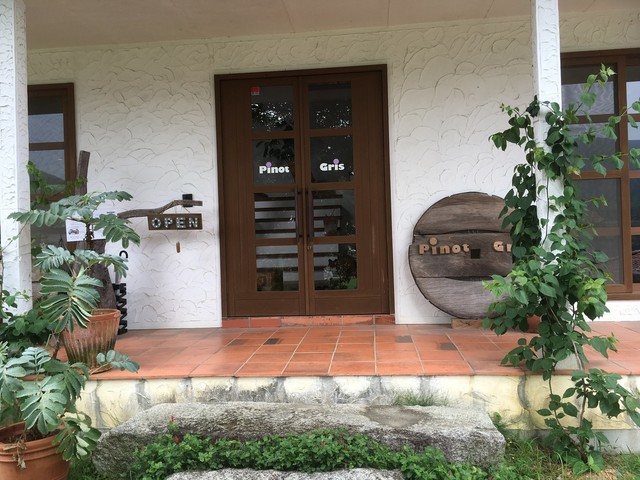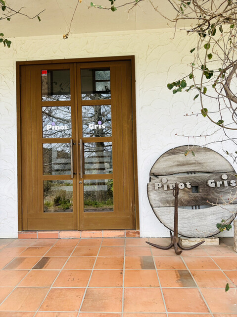 森の中の一軒家カフェ【Pinot・Gris】。エビとチキンの旨味がグッとくる『グリーンカレー』や季節のフルーツのオープンサンド、甘すぎない大人のパフェたち。「ピノグリ」とは、フランスではよく知られた白ワイン用ブドウの品種。以前、ブドウ畑だったこともあり、命名されたとか。店内はギャラリーを兼ねており、木彫作家であるご主人作のオブジェたちが心を癒してくれます。海とは違う糸島の景観もピノグリのご馳走です