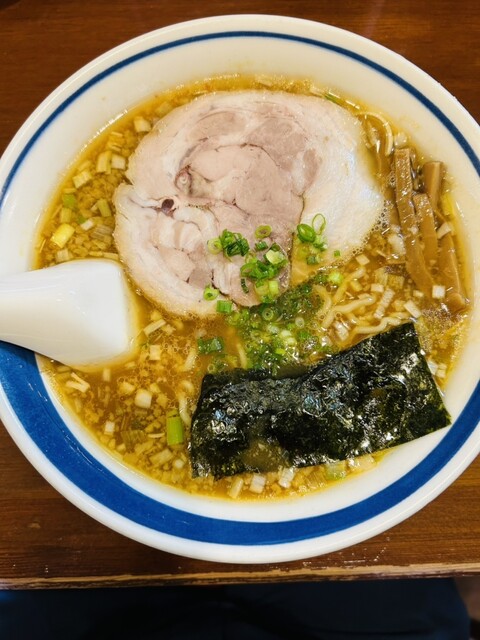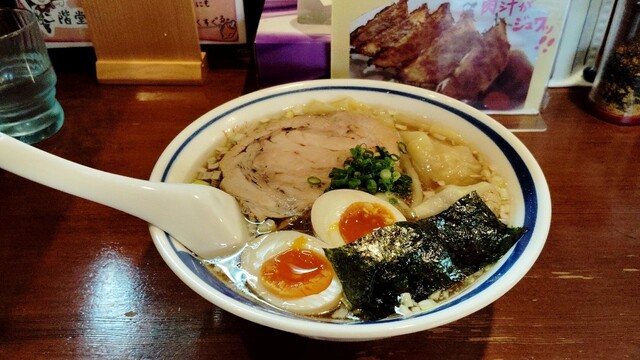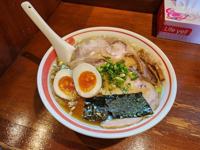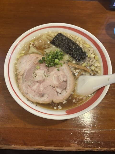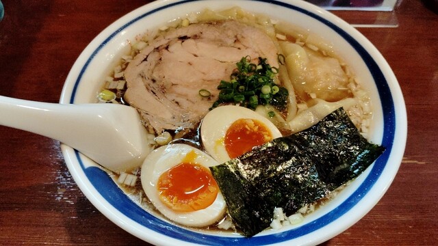 福島の人気ラーメン店、だし塩味の効いたスープが印象的、ワンタンも厚めのしっかりした生地がモチッつるで美味しい、スープの主張塩味旨味が強いので細麺を小麦の主...