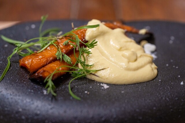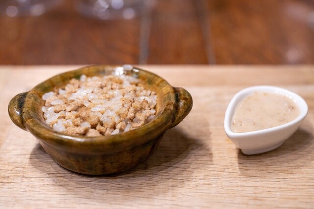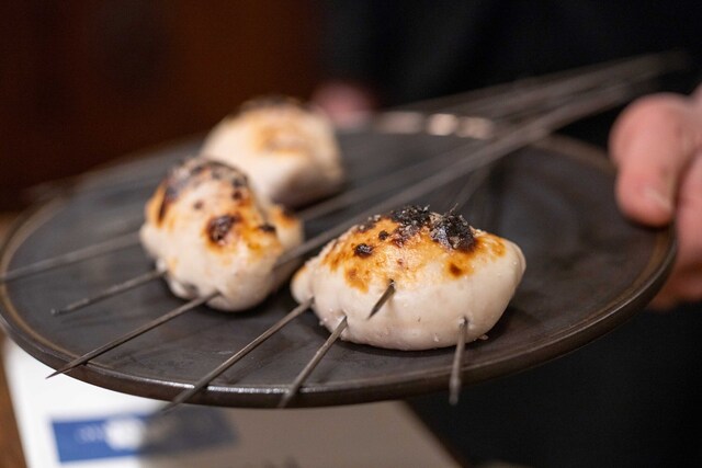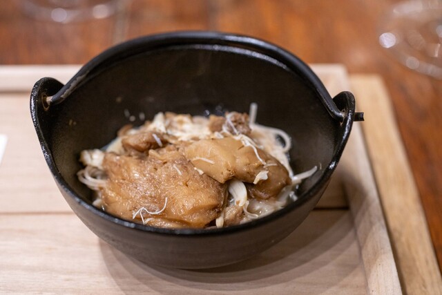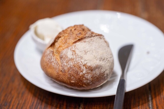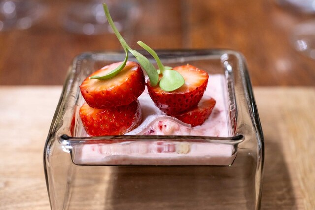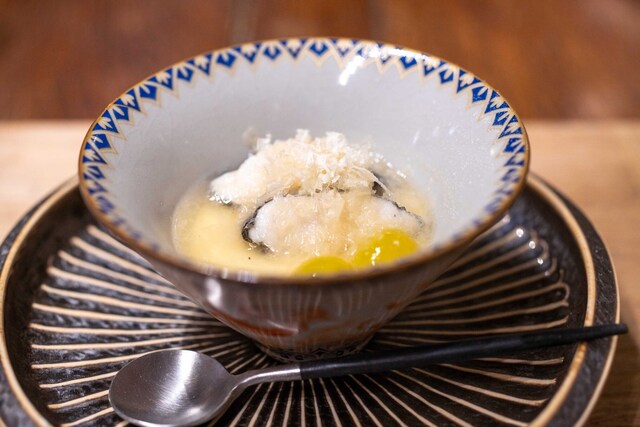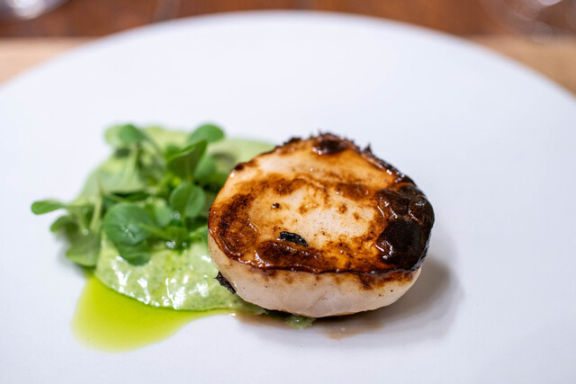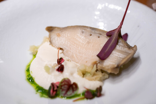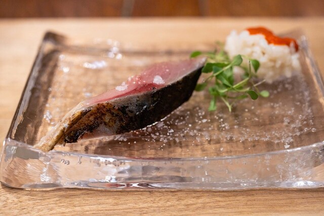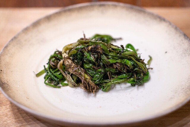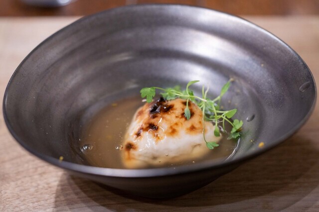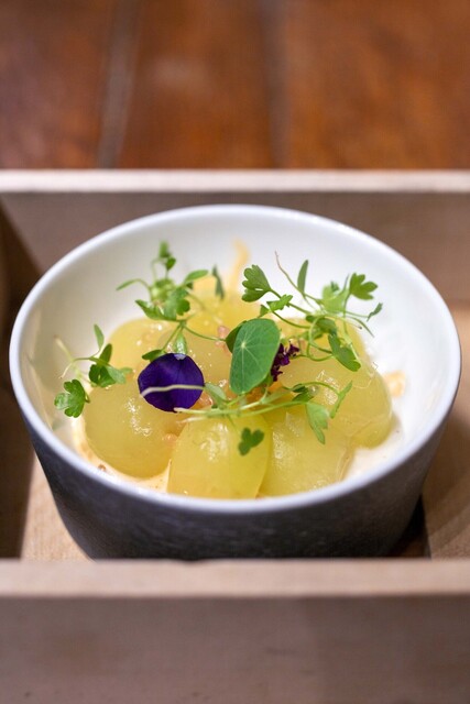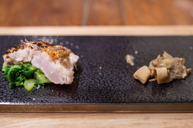 地元いわきをはじめ、福島県の生産者から直接仕入れる選りすぐりの食材を使うフランス料理店。かつては熟成させて旨みを上げることにこだわった時期もあったが、近年は「巻き戻しのきかない“鮮度”という命を大切にしたい」と水揚げされたばかりの魚、採れたての野菜の鮮度を活かす調理を徹底。たとえば、朝獲れのメヒカリを薪焼きにして、菊芋のピュレと発酵白菜をソース代わりに添える。ここにしかない鮮烈な旨さを体験できる。