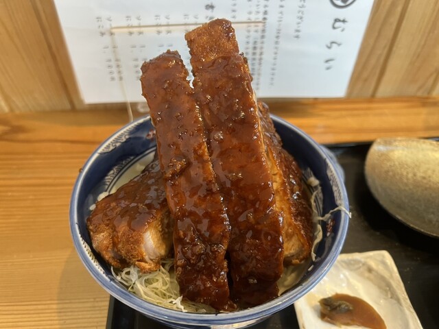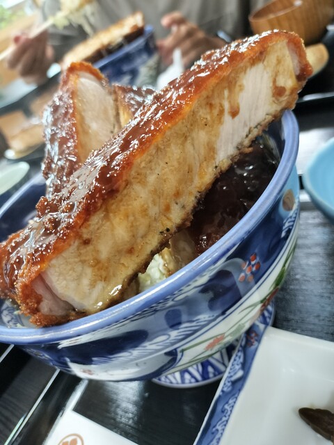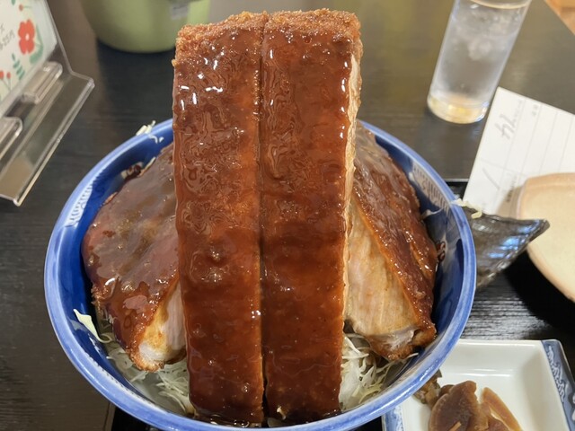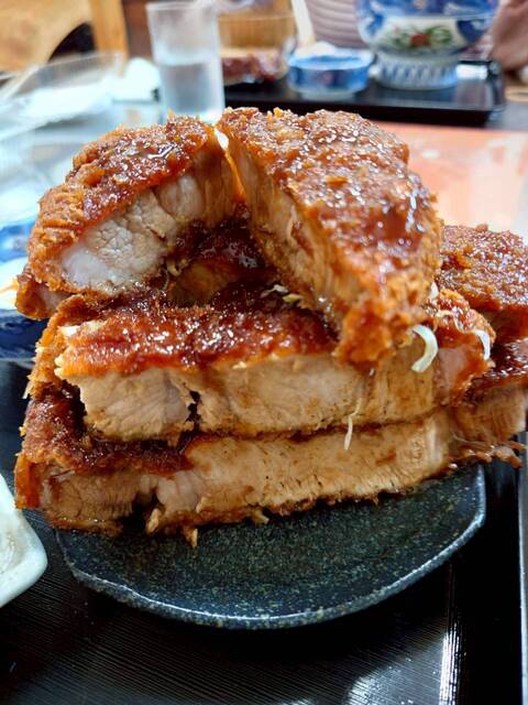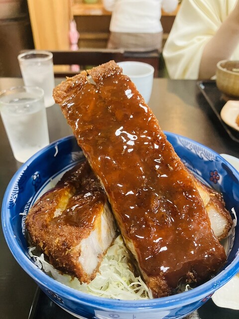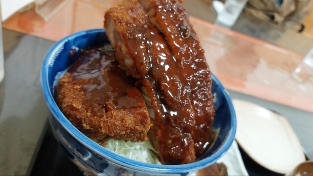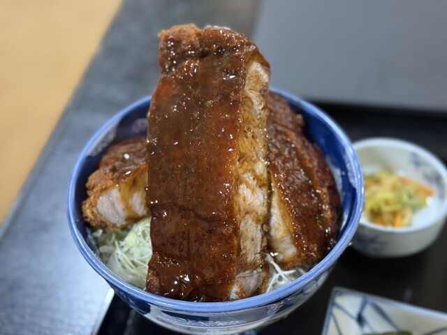 丼からはみ出さんばかりのロースかつは、一切れがまるでステーキのような厚さ!しかし、食べてみると驚くほど柔...