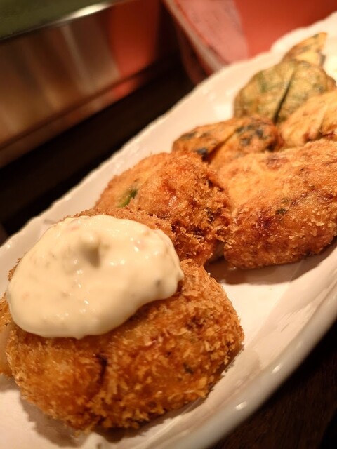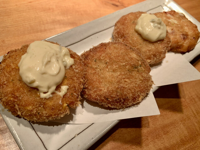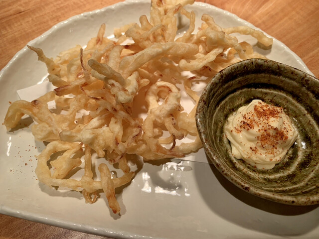 さきいかの天ぷら 弾力のある食感があって美味しい。マヨネーズをつけて