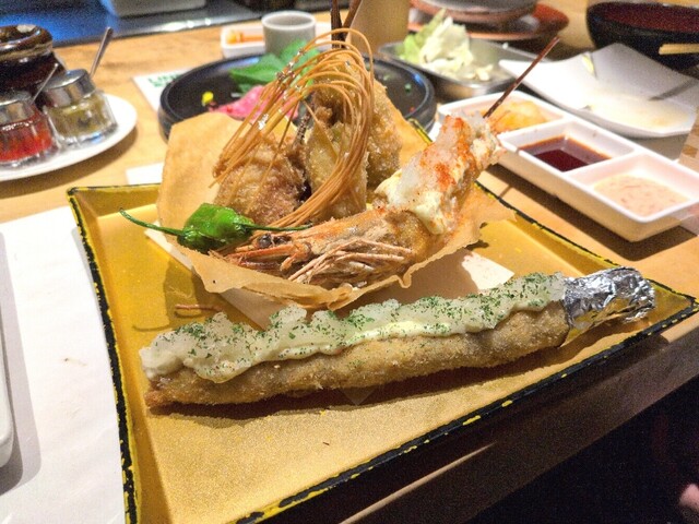 友達は日本酒に手をだした(笑)おでんには日本酒ですね!揚げ物盛り合わせは1つでも量がたっぷり。見た目も映えます。