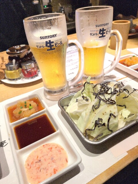 お通しはキャベツ昆布、揚げ物用の3種のソースも運ばれてきました。