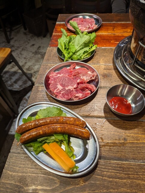 《注文品》 『ジンギスカンセット』¥1,380(税抜) 『ラムソーセージ』¥680(税抜) 『サーロイン』¥1,280(税抜) 『ハツ』¥780(税抜) 『タン』¥880... 詳細を見る