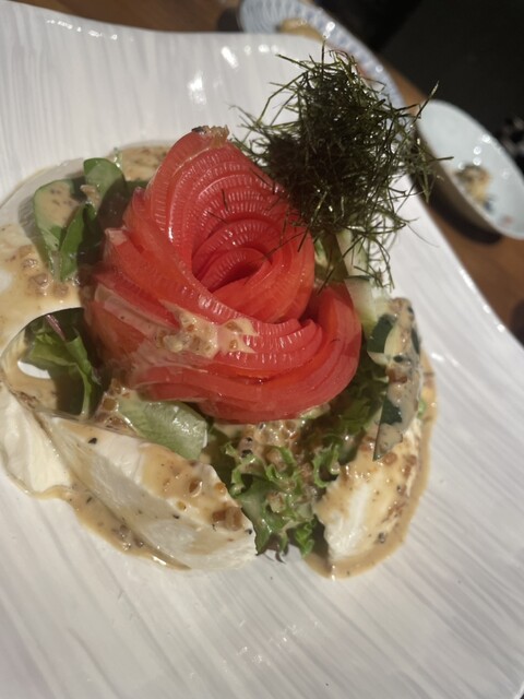 料理は、前菜から始まり、刺身、牡蠣の土瓶蒸し、蟹の甲羅、メニューには無い麻婆豆腐や焼きそばが出てきました。