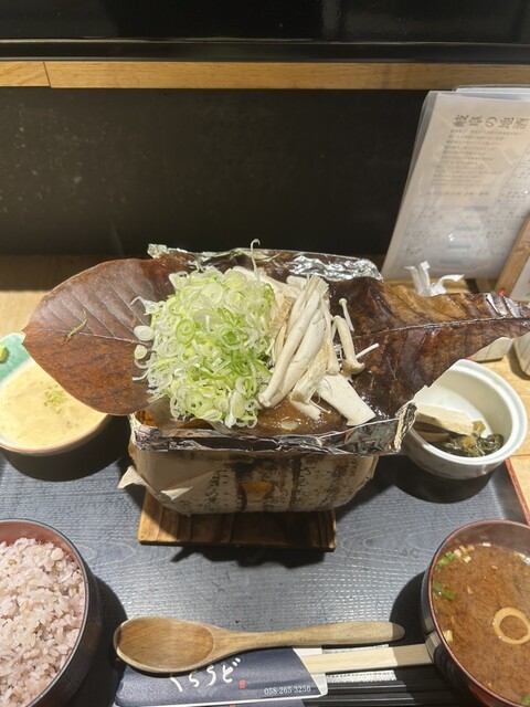 鮎や朴葉味噌といった岐阜県の郷土料理を楽しめるお店。わたしは、ネギの朴葉味噌焼きととろろご飯のセット1200円を注文。肉や魚といったタンパク質はなく、野菜を中心とした優しいメニュー。ほっと一息つけました。