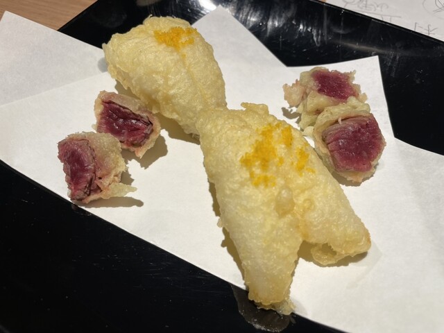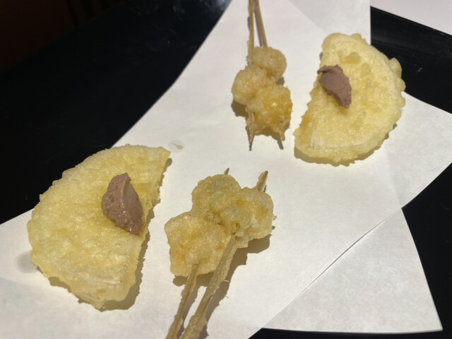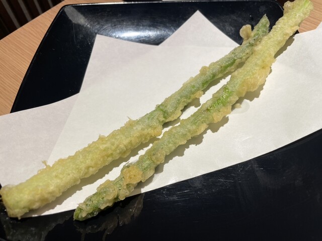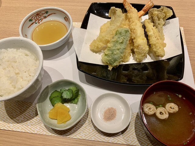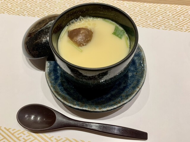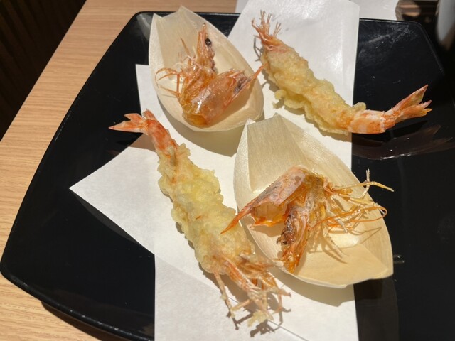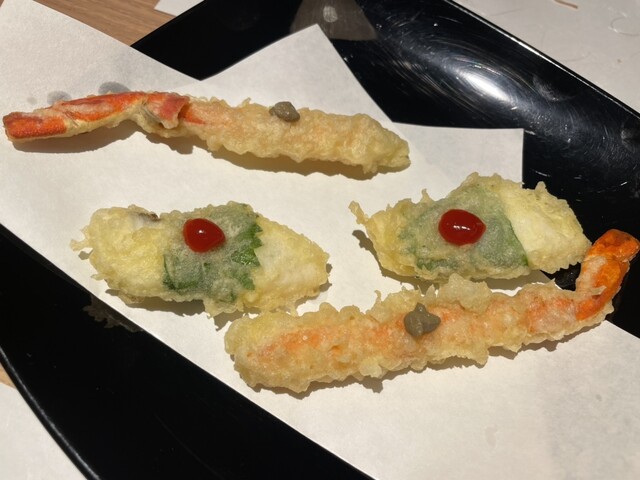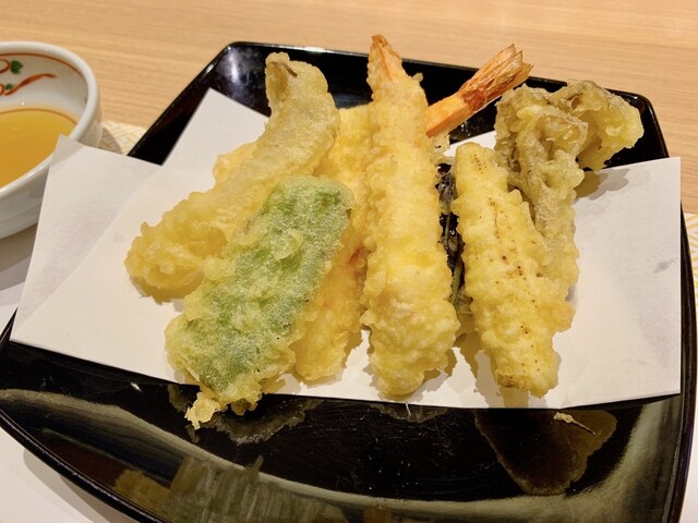 優しい味わいの茶碗蒸しをいただきながら、天ぷらを揚げる音に耳を傾ける。しばらくして、衣を纏った食材達が登場。揚げたて熱々をぱくり、美味しい〜。さっくりと揚...