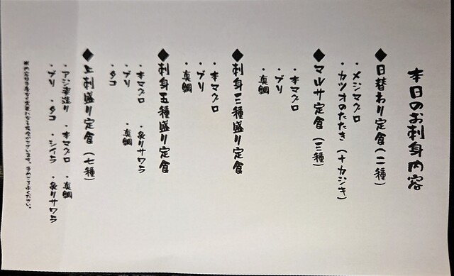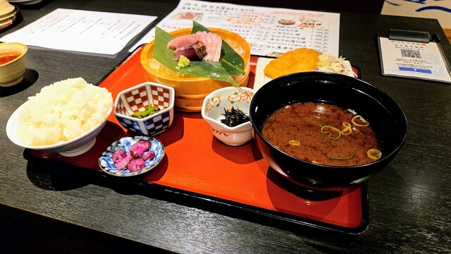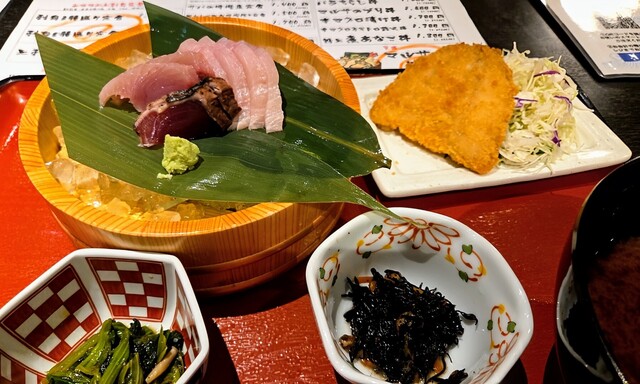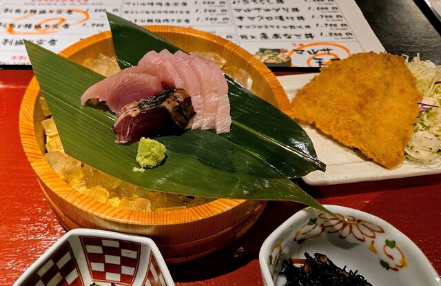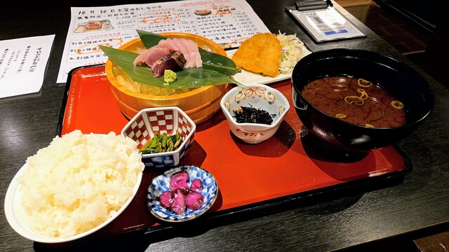内容は、本日のお刺身2種盛り(メジマグロ、カツオのたたき+カジキ)、本日の揚げ物(アジフライ)、小鉢2品(ひじきの煮物、青菜の煮物)、ご飯、味噌汁、漬物です。