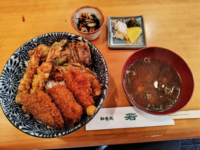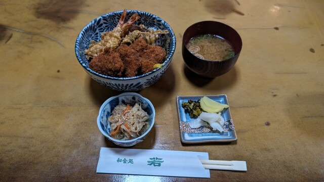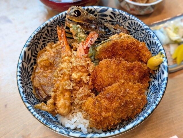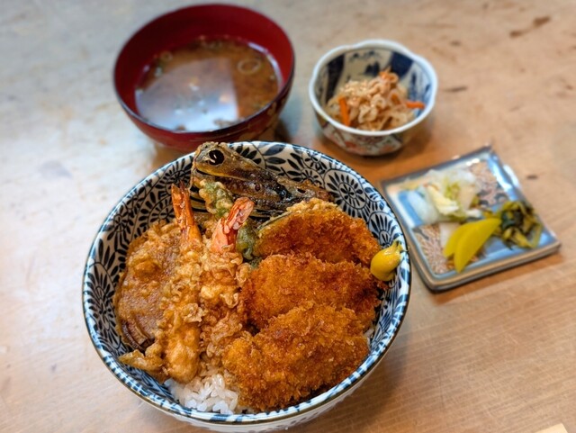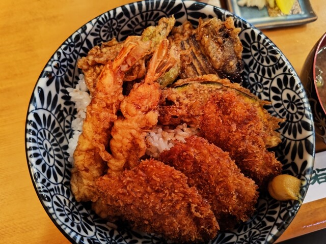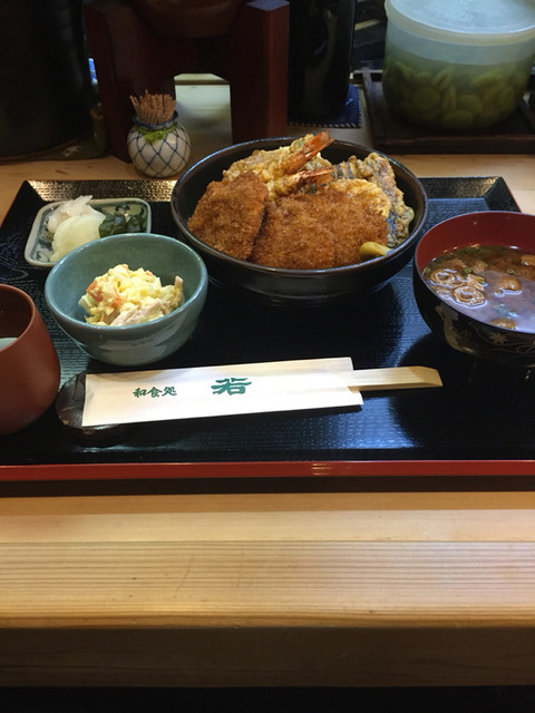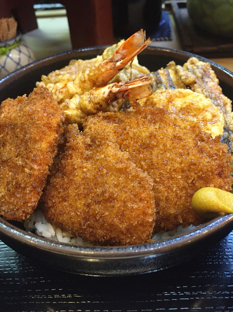 美濃加茂市役所近くの老舗料理店でランチしました♪名物ランチメニューで天丼とカツ丼が合体した「天カツ丼(880円)」をチョイス♪天丼部分はノーマルでカツ丼はソース味のヒレでした!!料理店だけあって、味噌...
